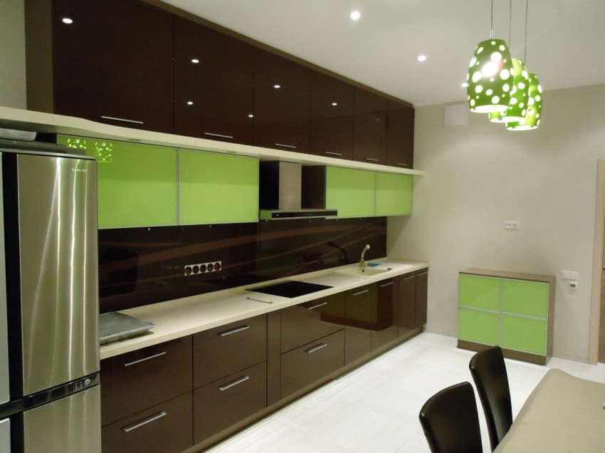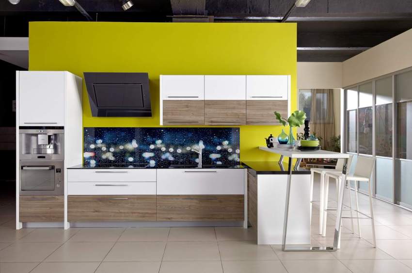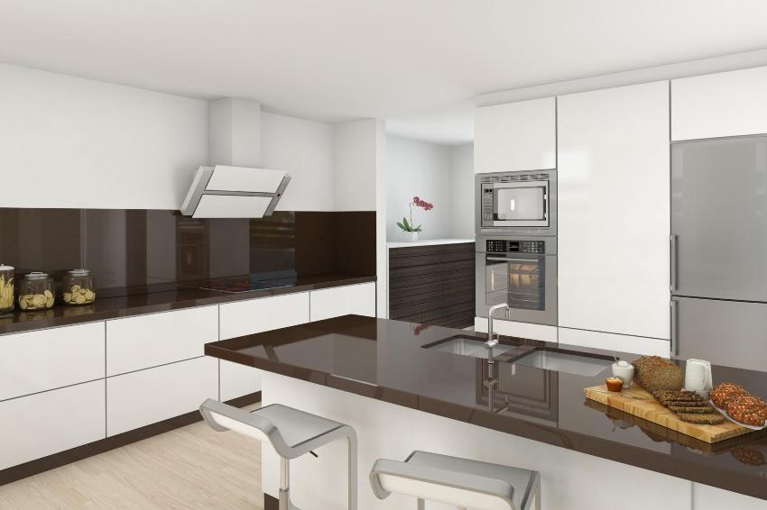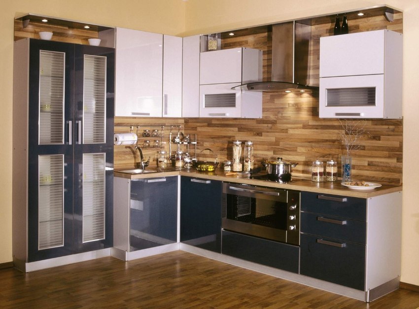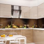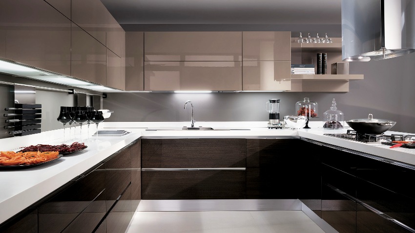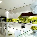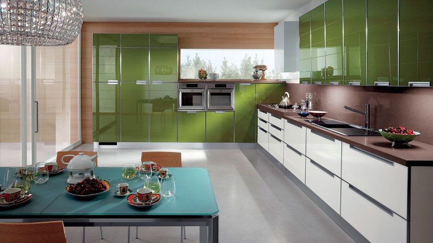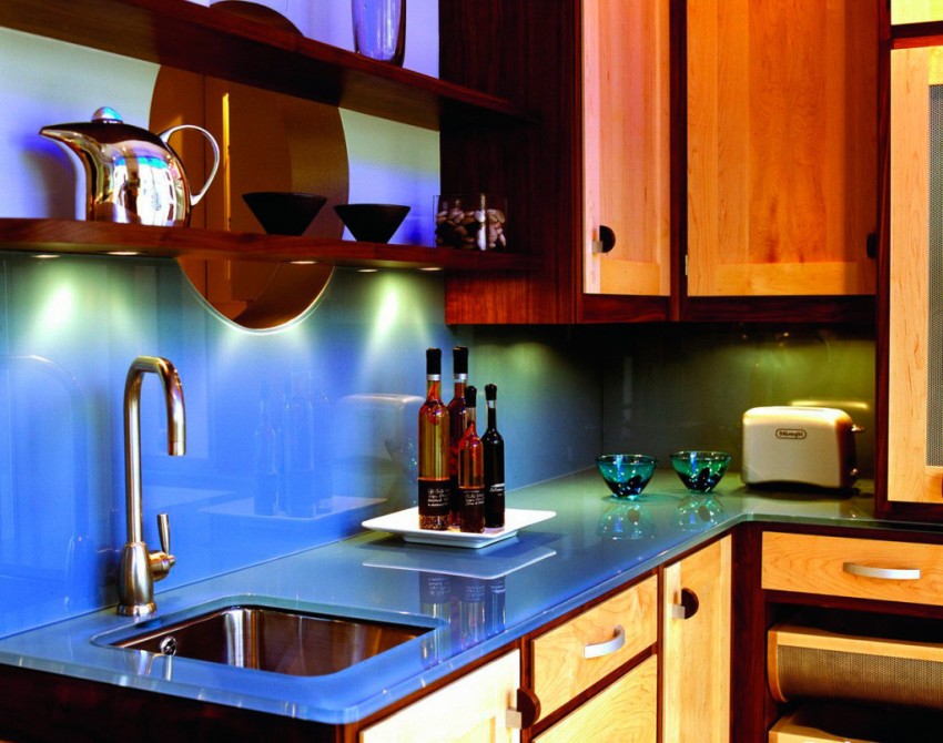 Panel kaca di atas dapur dan permukaan kerja akan menambah kemewahan dan keunikan pada bahagian dalaman dapur moden
