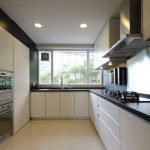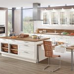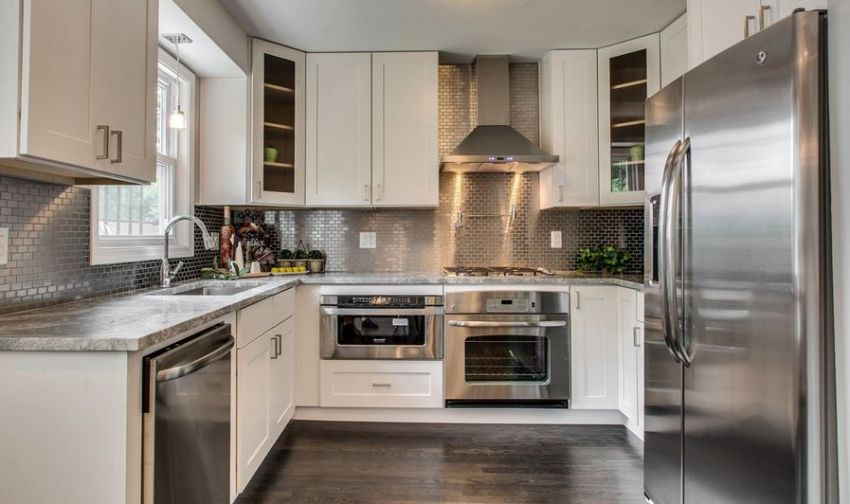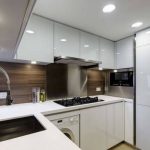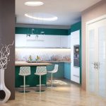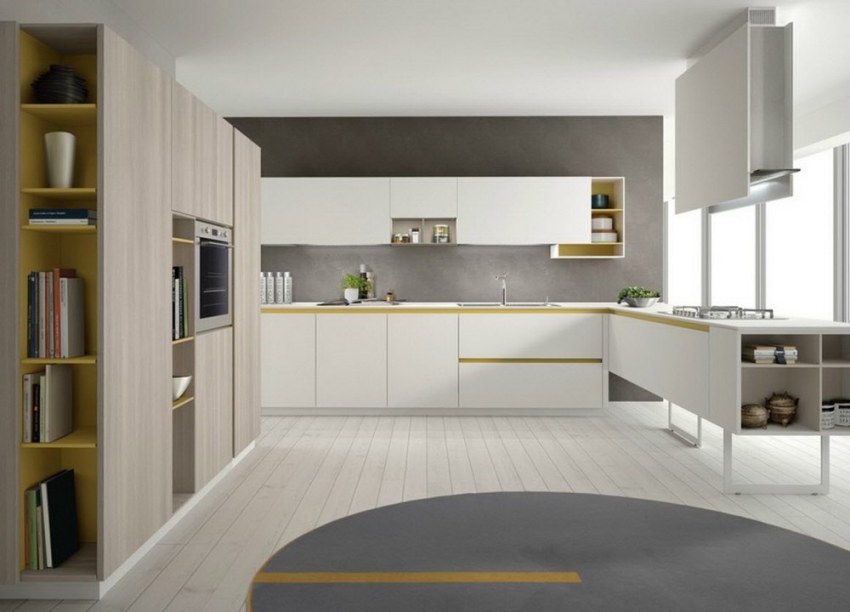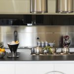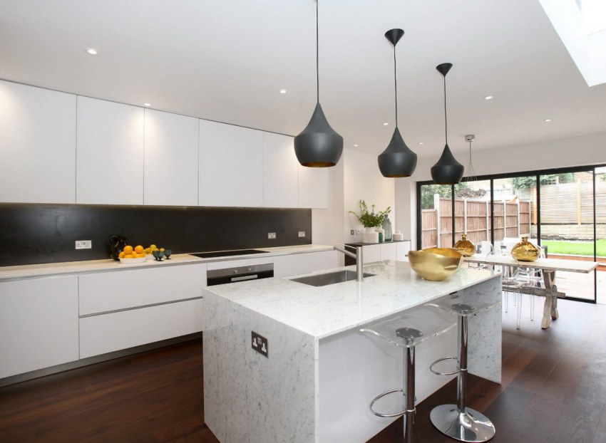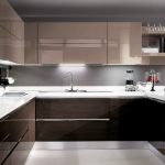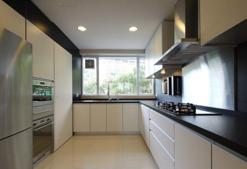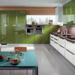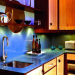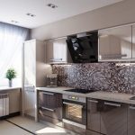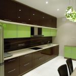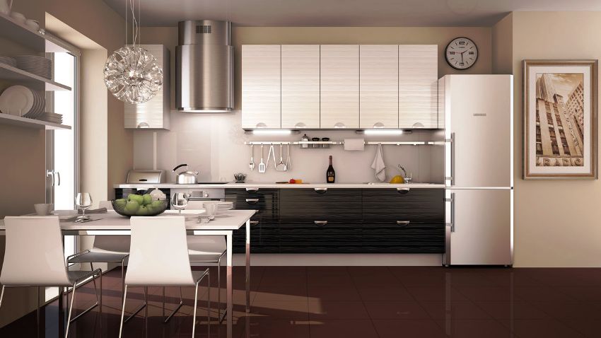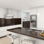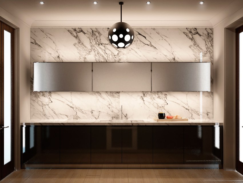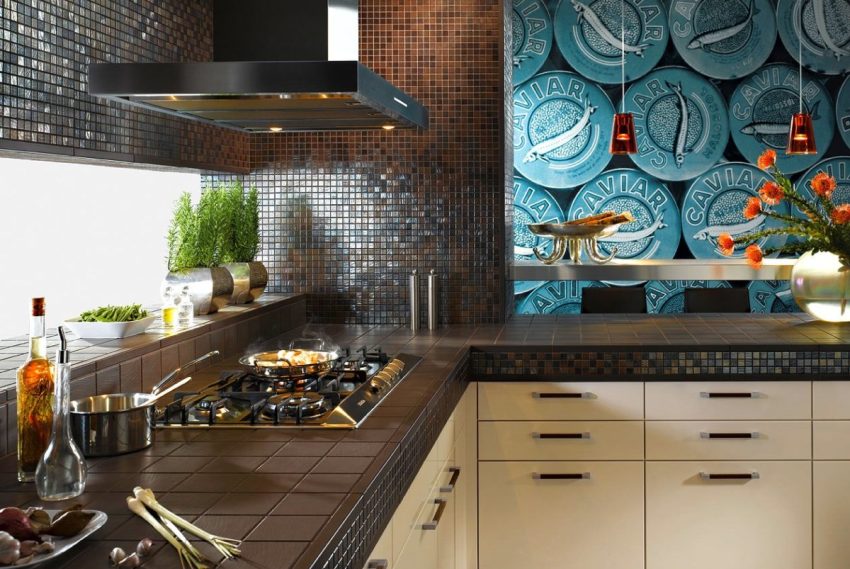 Panel kaca di atas dapur dan permukaan kerja akan menambah kemewahan dan keunikan pada bahagian dalaman dapur moden