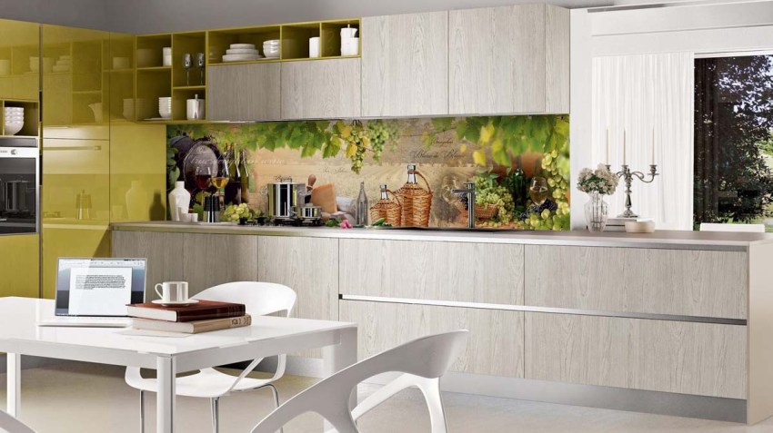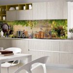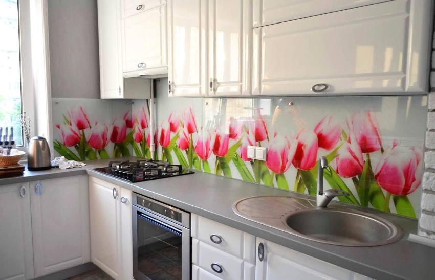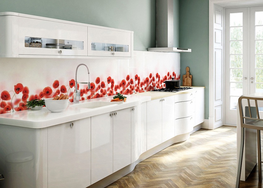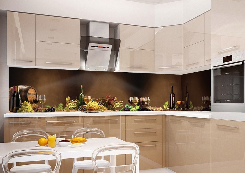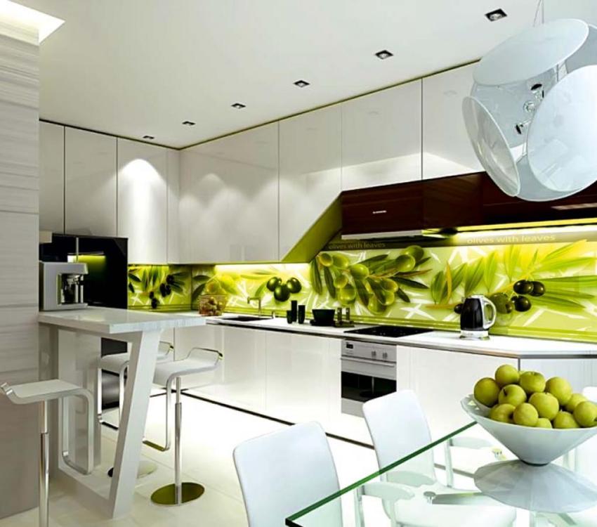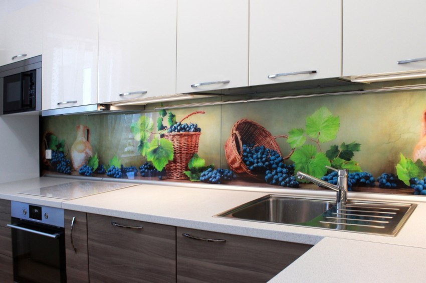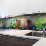 Pilihan paling popular dalam senarai panel ini dengan percetakan foto. Sebagai contoh, apron kaca dengan gambar beri dan buah-buahan berair akan menambahkan rasa optimis dan kehangatan di bilik.