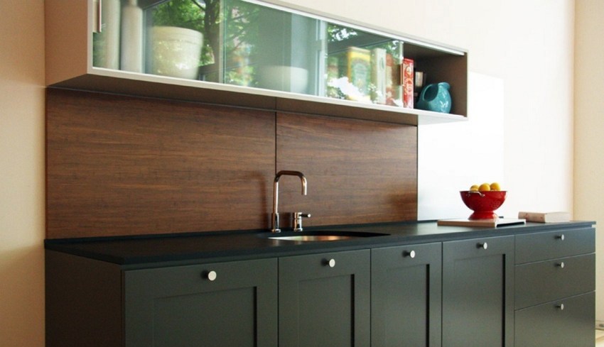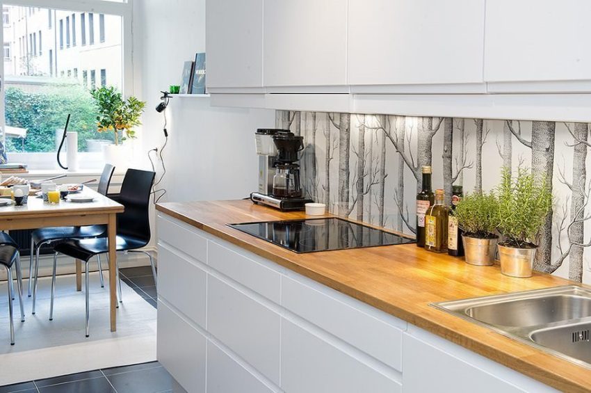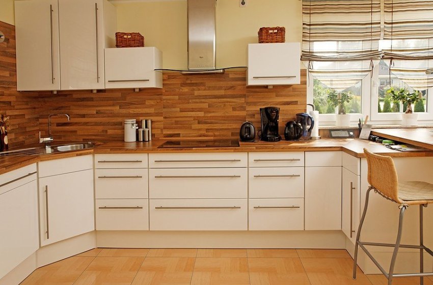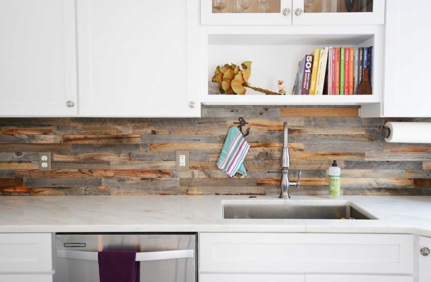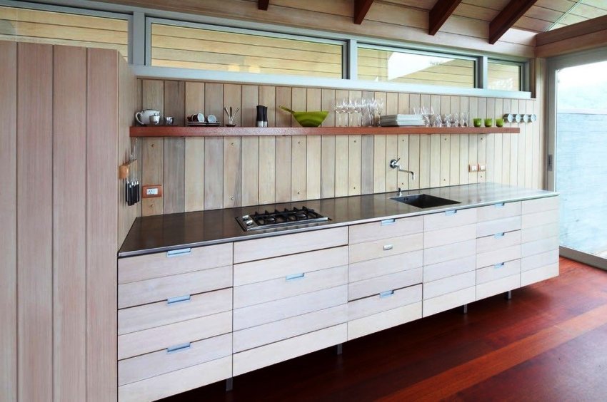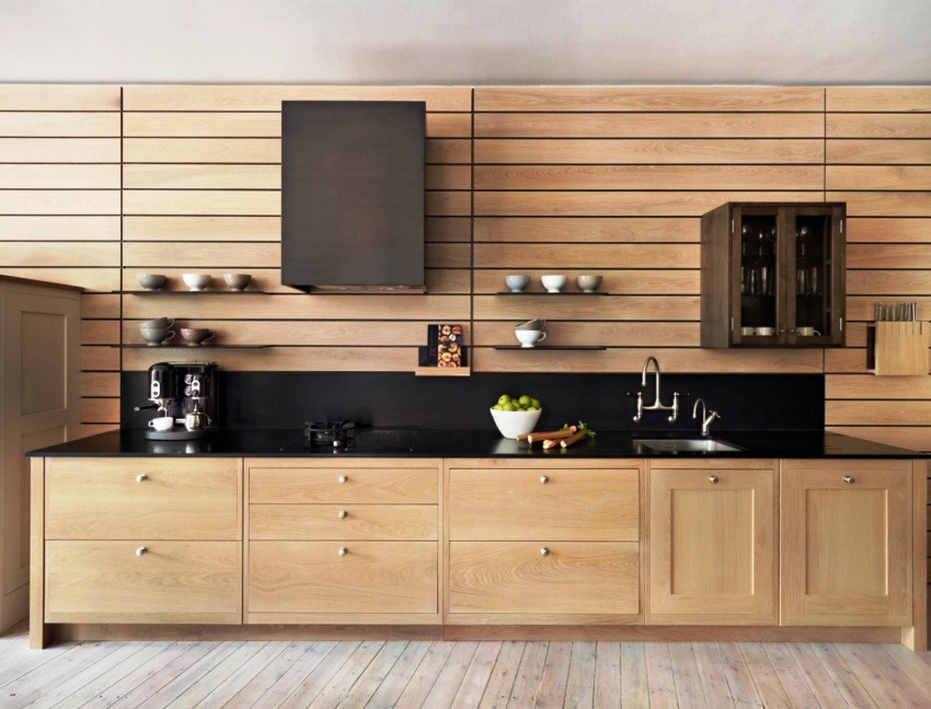 Semasa mengutamakan kayu, perlu diingat bahawa bahan ini dicirikan oleh ketidakstabilan. Contohnya, apabila terkena udara panas, kayu dapat mengering, yang akan menyebabkan retak, dan apabila terkena wap dan air, kayu itu dapat membengkak. Oleh itu, pelapisan kayu semula jadi tidak boleh digunakan di belakang sink dan kompor, di kawasan di mana cerek elektrik atau multicooker berada.