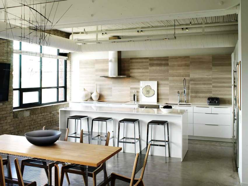Nasihat berguna! Untuk membuat dalaman bergaya loteng yang ideal dan pada masa yang sama, anda boleh menggunakan panel bata plastik. Bahan tersebut tidak hanya menutupi apron, tetapi juga salah satu dinding dapur.