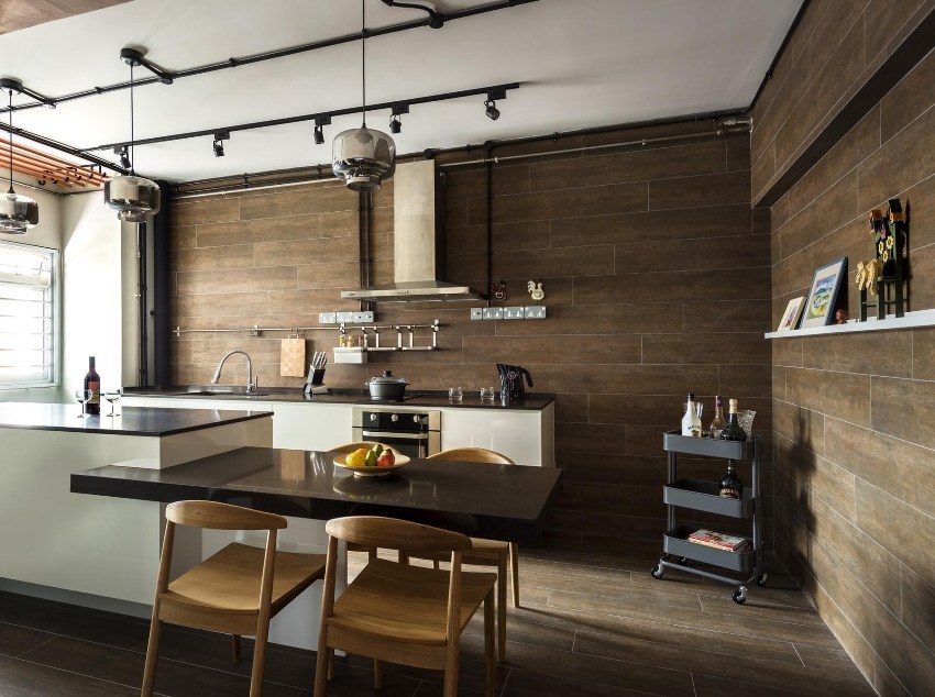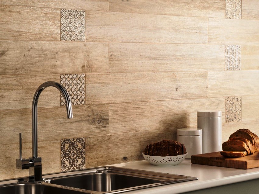 Nasihat berguna! Mereka yang tidak dapat sepenuhnya meninggalkan panel kayu mewah harus mengecualikan pemasangannya di kawasan memasak. Demi kepraktisan, kepingan kayu boleh digabungkan dengan jubin seramik atau dikulit di belakang sink dan dapur.