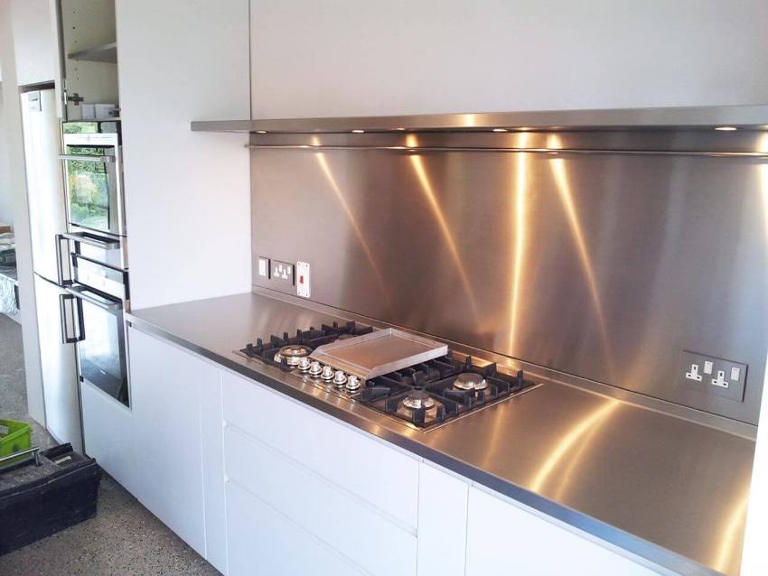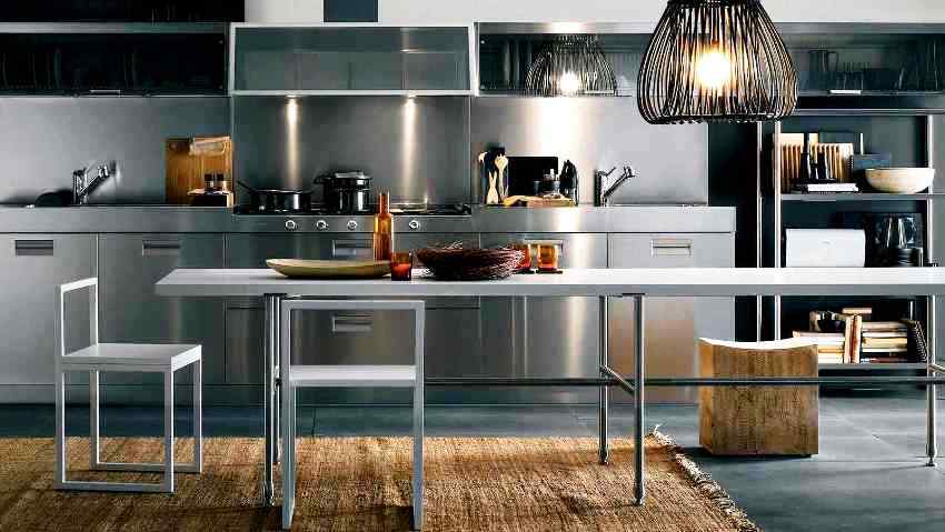 Panel logam di dinding kerja akan sepadan dengan fasad alat dengar dengan warna perak sejuk yang sama. Gabungan ini sesuai dengan gaya loteng dan berteknologi tinggi. Pemasangan plat logam dilakukan dengan memasang panel pada rel plastik. Bekerja dengan kayu dan logam memerlukan alat dan kemahiran khas, jadi lebih baik mempercayakan pekerjaan itu kepada tukang yang berpengalaman agar tidak merosakkan bahan yang mahal.