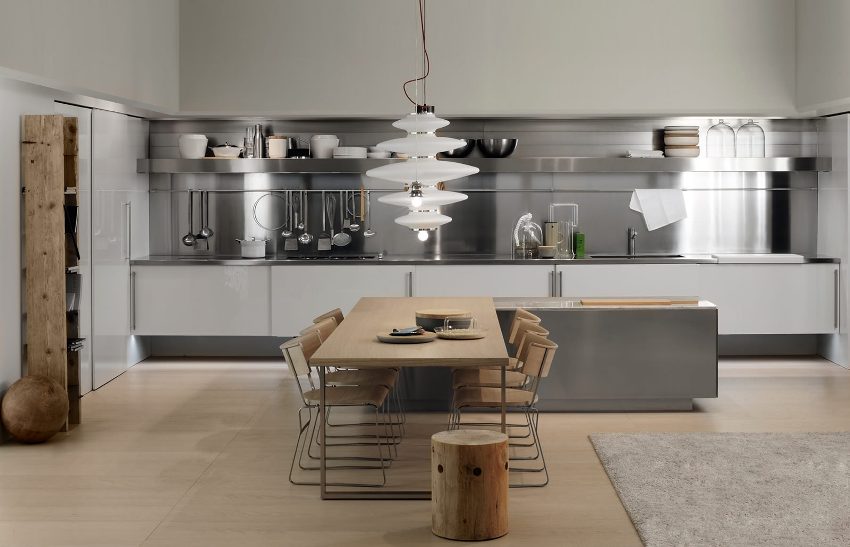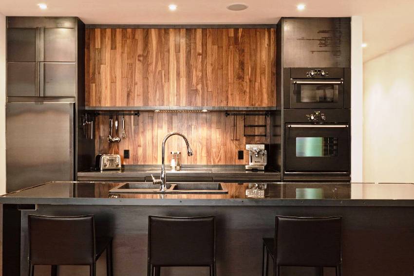 Panel dapur diperbuat daripada kayu dan logam: pilihan untuk hiasan dalaman yang mewah