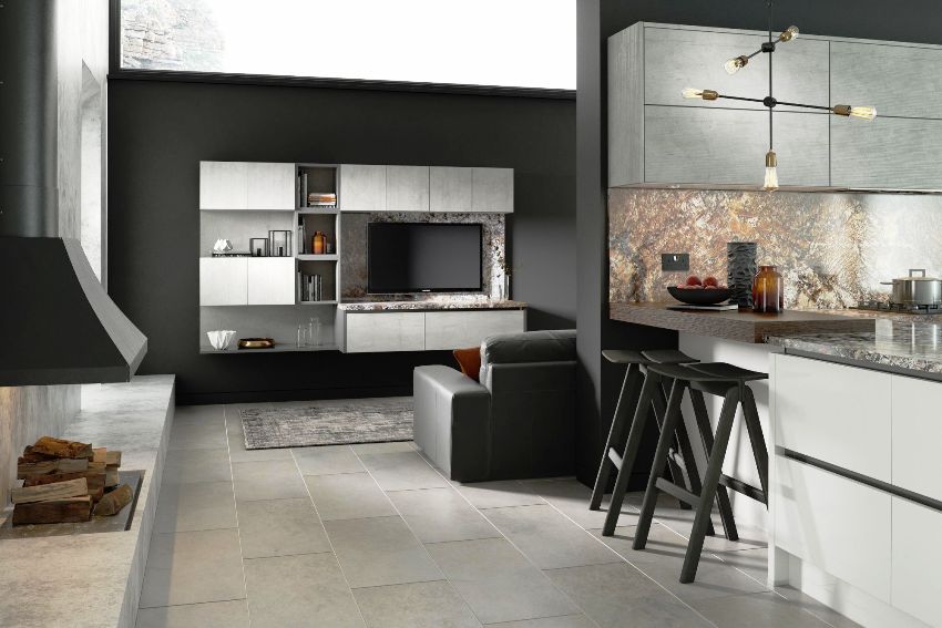 Ciri-ciri lapisan berlapis dan pelbagai ukuran dan reka bentuk hiasan permukaan membolehkan anda memasang kanvas, baik secara menegak dan melintang, di kawasan tertentu. Oleh itu, selalunya ia dipilih sebagai pelapis untuk countertop dan apron di dapur. Foto jelas menunjukkan keharmonian dalaman seperti itu. Model kelihatan paling cantik, dengan warna yang sama dan dengan nada yang berbeza. Perkara utama adalah bahawa dalam duet seperti itu, tekstur dan tekstur bahan harus sama.