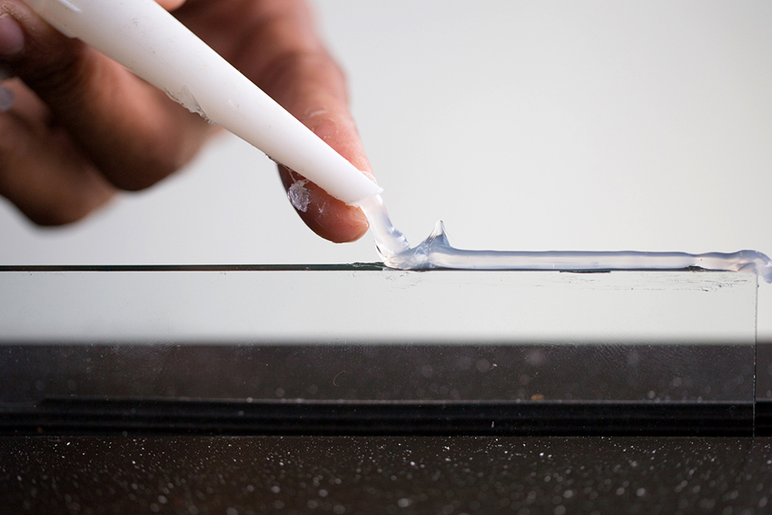 - Sapukan pelekat di sekeliling perimeter di bahagian belakang cermin, tetapi tidak ke tepi. Jika tidak, komposisi cecair akan bocor keluar dan merosakkan penampilan produk.