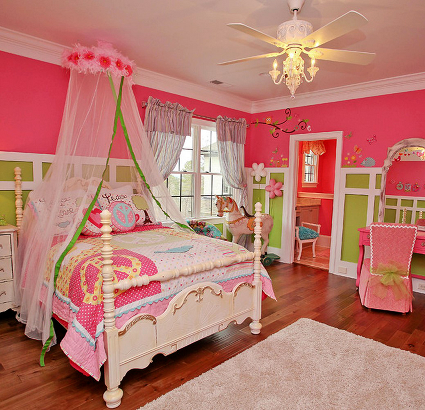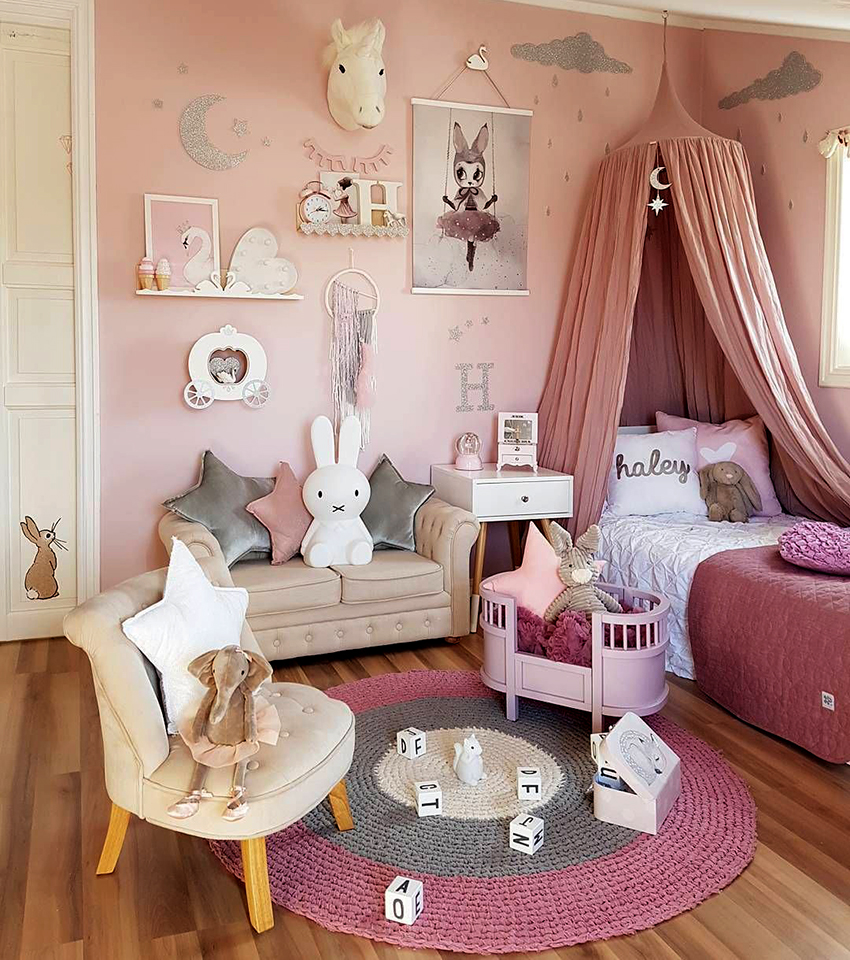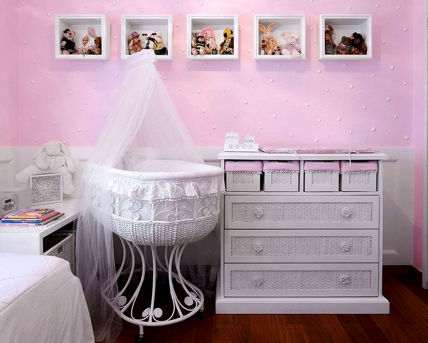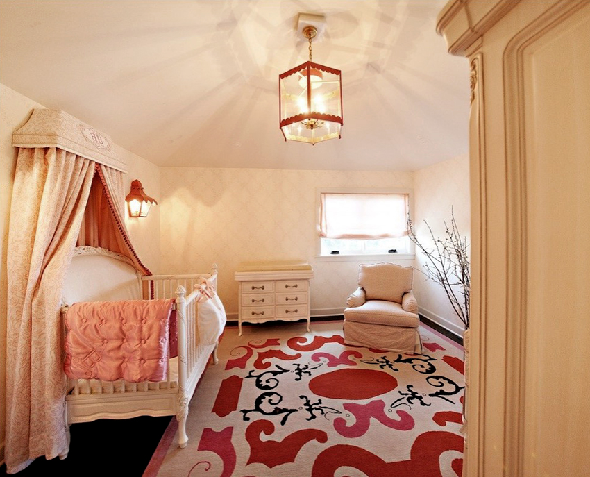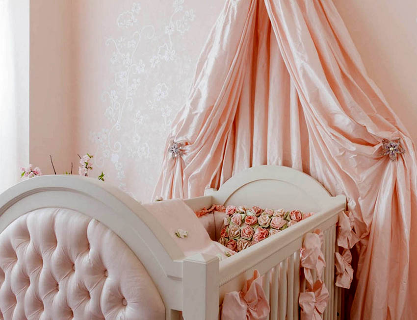 Selalunya, ibu bapa gadis kecil menghiasi taman asuhan kanak-kanak dengan gaya "puteri". Reka bentuk ini berdasarkan penggunaan nada merah jambu. Menurut ahli psikologi, ketika memilih kanopi untuk buaian, seseorang harus lebih mengutamakan fabrik warna. Warna-warna terang yang luar biasa boleh menyakitkan dan menjengkelkan.