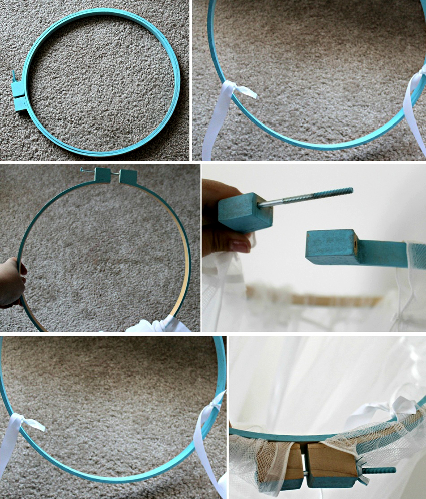 Sekiranya kanopi dibuat secara bebas, timbul persoalan bagaimana menggantung kanopi di atas katil bayi. Untuk ini, anda boleh menggunakan pendakap pegangan. Produk sedemikian dijual di kedai kanak-kanak khusus dan merupakan tiub aluminium yang melengkung di bahagian atas dan dilengkapi dengan gelung logam (cincin).