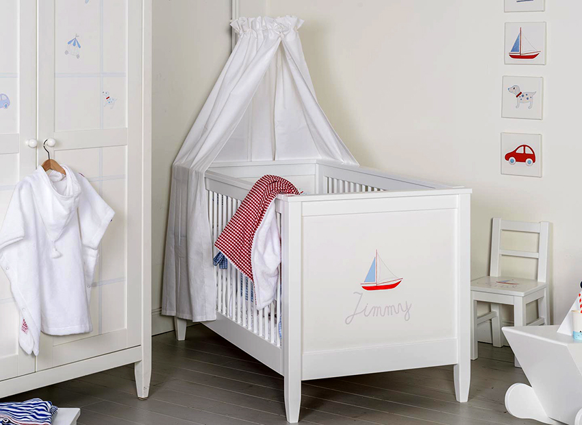 Reka bentuk dan gambar katil bayi dengan kanopi untuk kanak-kanak lelaki