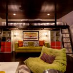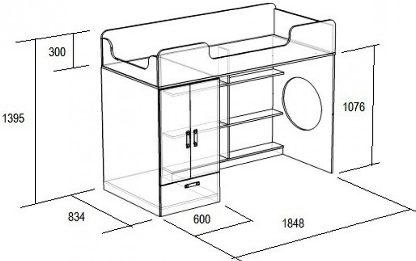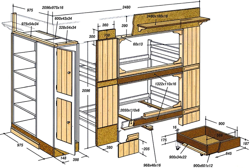 Di ruang kosong yang terbentuk di bawah katil loteng do-it-yourself, anda boleh memuatkan almari pakaian yang luas. Pintu dipasang paling baik di sisi struktur. Dinding kedua dalam kes ini akan menjadi titik tumpu tambahan. Di ruang kosong yang tinggal, anda boleh memasang rak dengan rak terbuka atau meja. Tempat tidur kanak-kanak dengan laci sangat popular, yang memenuhi ruang bawah tempat tidur.