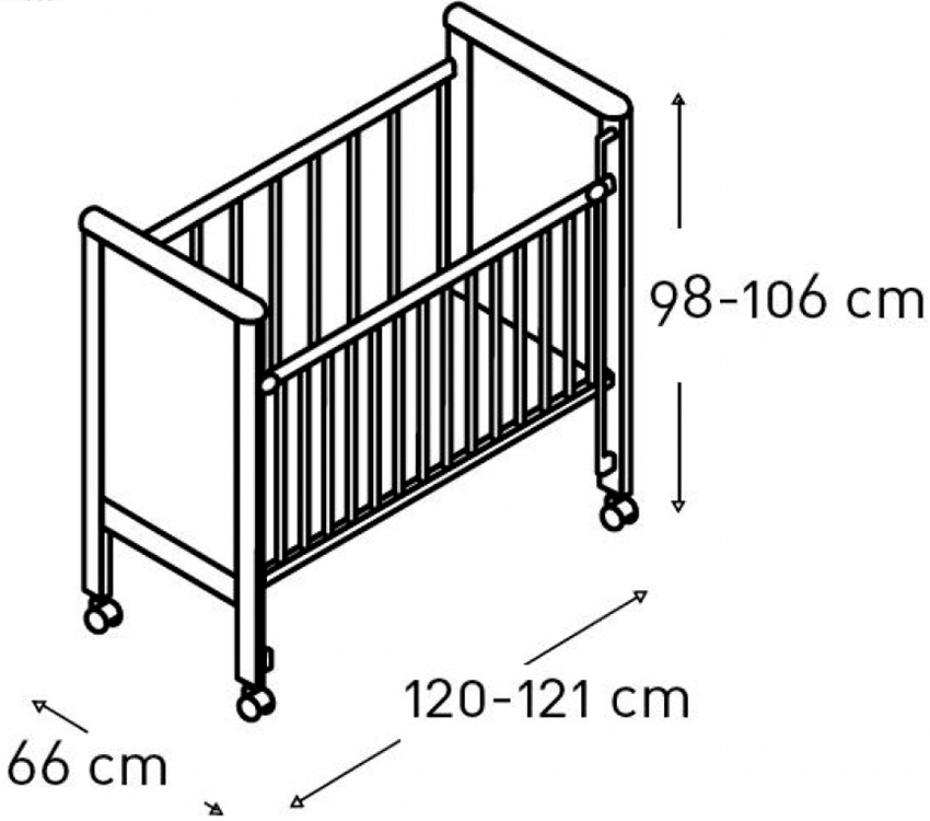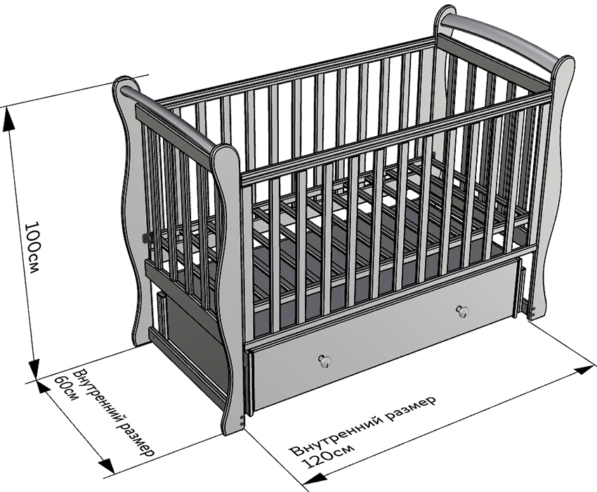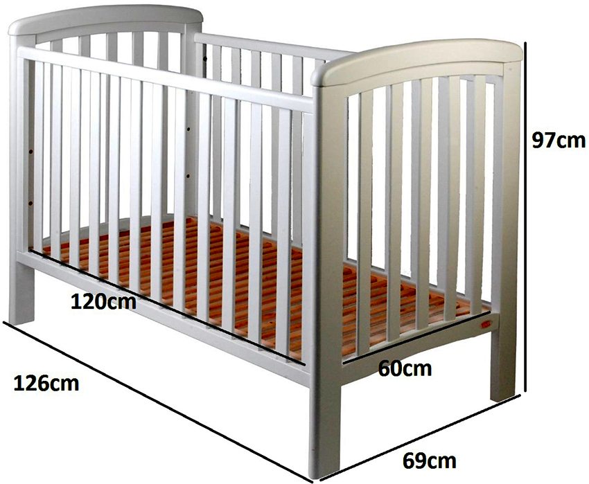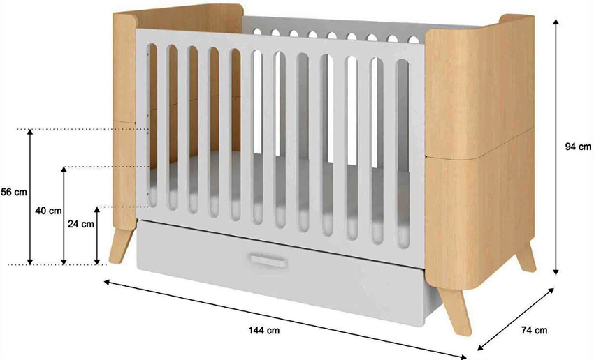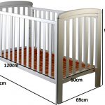 Ukuran tempat tidur untuk bayi yang baru lahir dengan reka bentuk standard adalah 60x120 cm. Dinding sisi boleh ditanggalkan. Ketinggian tempat tidur yang relatif dengan lantai dapat diubah, yang memungkinkannya menyesuaikan diri dengan usia anak. Boks buaian sendiri dengan lebar 70 cm dan panjang 130 cm. Reka bentuknya dilakukan dengan pagar pelindung yang boleh ditanggalkan. Dimensi tempat tidur gelongsor, alat yang membolehkan anda mengubah ukurannya dengan pertumbuhan anak, dapat mencapai panjang 160-170 cm.