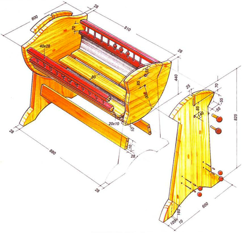 Bahagian sisi katil dibuat, ukurannya berbeza. Palang melintang yang lebih rendah di bahagian belakang disambungkan dengan unsur-unsur ini. Panjang pintu belakang adalah sama dengan panjang kerusi dengan kelonggaran 1 cm. Untuk mendapatkan ketinggian sisi, perlu mengurangkan ketinggian bilah melintang bawah dari 90.