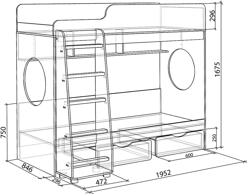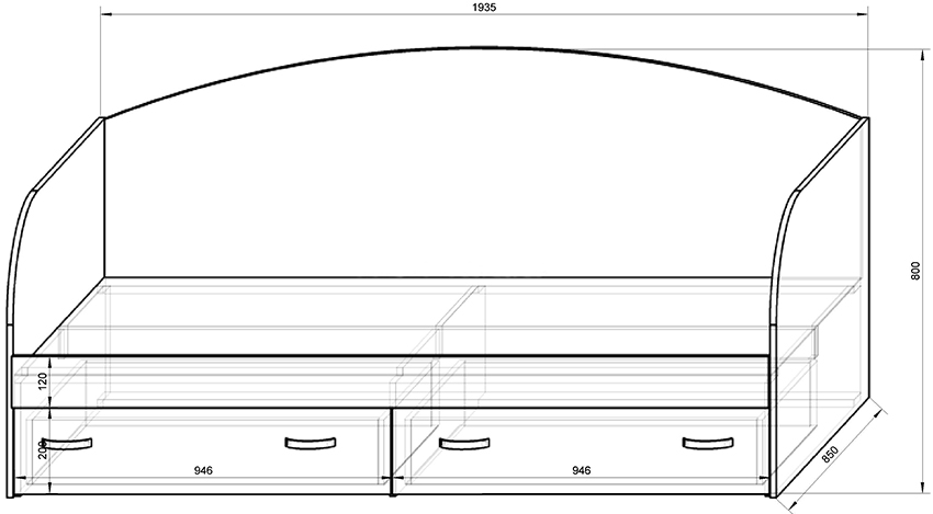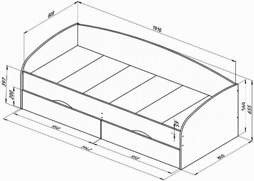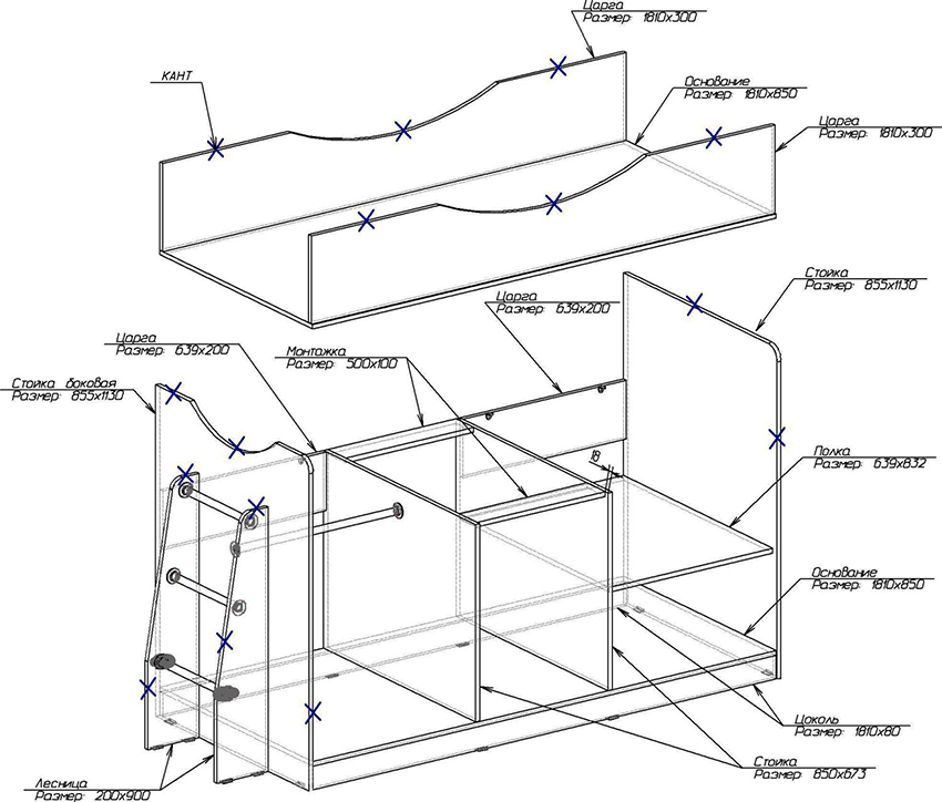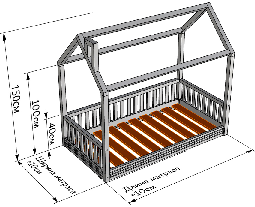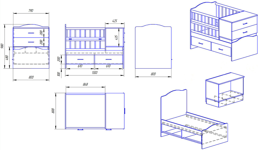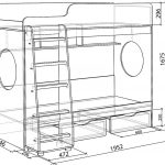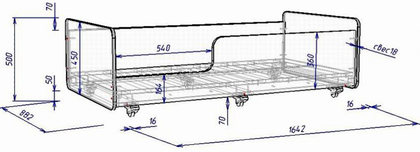Susunan struktur untuk kanak-kanak merangkumi pangkalan dan sandaran belakang, yang ditunjukkan dengan jelas dalam lukisan katil. Lebar dan panjang produk ditentukan dimensi tilam... Bahagian bawah tempat tidur tidak boleh lebih dari 35 cm dari lantai sehingga anak dapat dengan mudah memanjatnya.