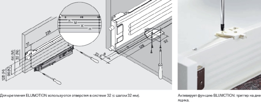 Langkah pertama ialah mengukur kotak. Selanjutnya, sesuai dengan tabel yang ditunjukkan dalam petunjuk, Anda harus memilih parameter yang sesuai, di mana titik pemasangan mekanisme utama ditentukan. Dari tengah panduan roller, jarak yang ditunjukkan dalam jadual diletakkan dan garis mendatar dilukis. Lebih jauh pada tanda mendatar diperlukan, menurut arahan, untuk menangguhkan jarak dari tepi fasad. Di tempat yang dimaksudkan, gerudi nipis digerudi. Laci yang lebih dekat diaplikasikan ke posisi yang dimaksudkan dan disisipkan ke dinding laci menggunakan skru mengetuk sendiri.