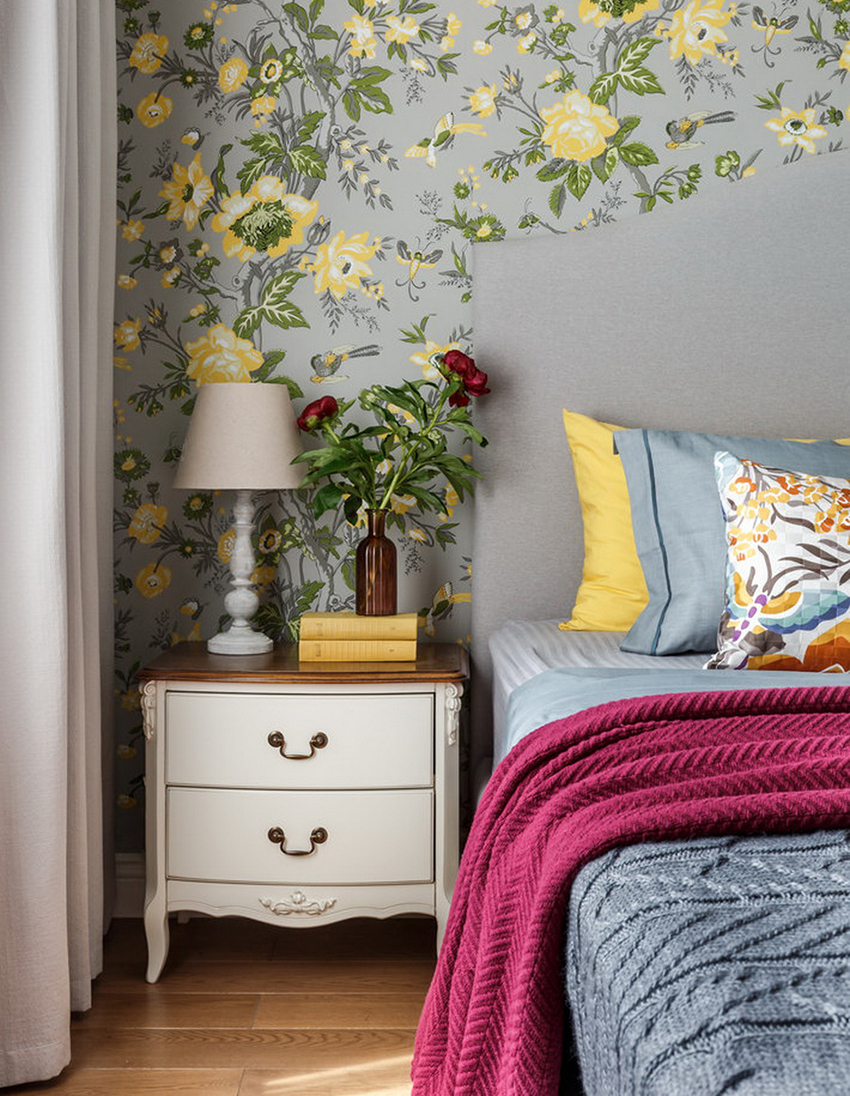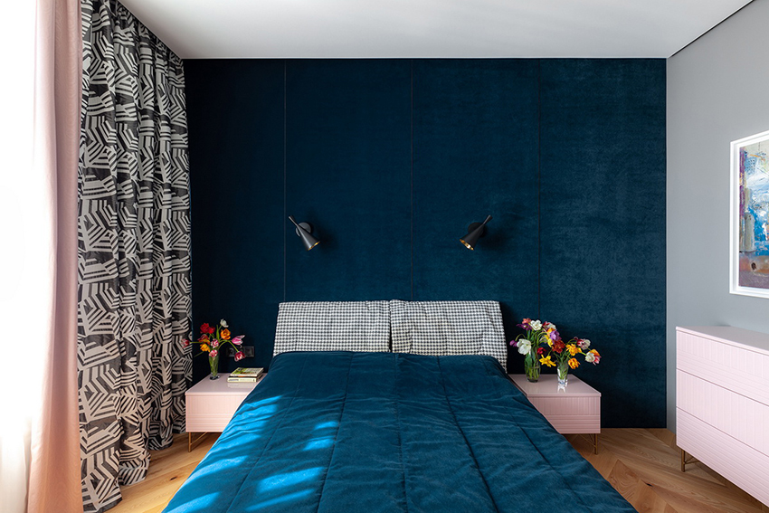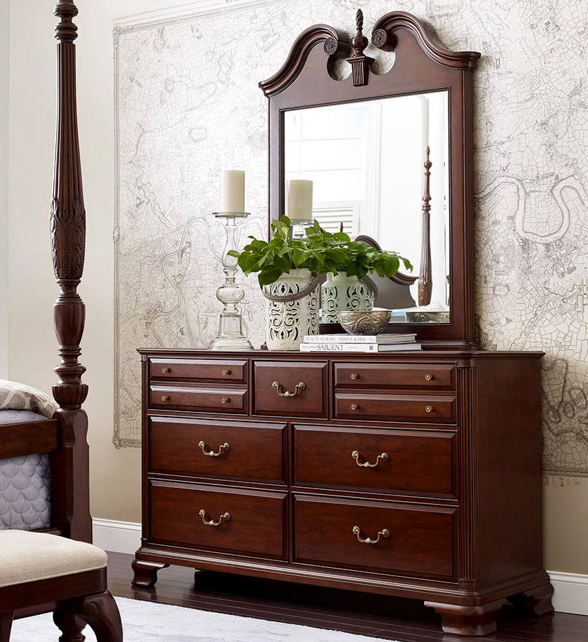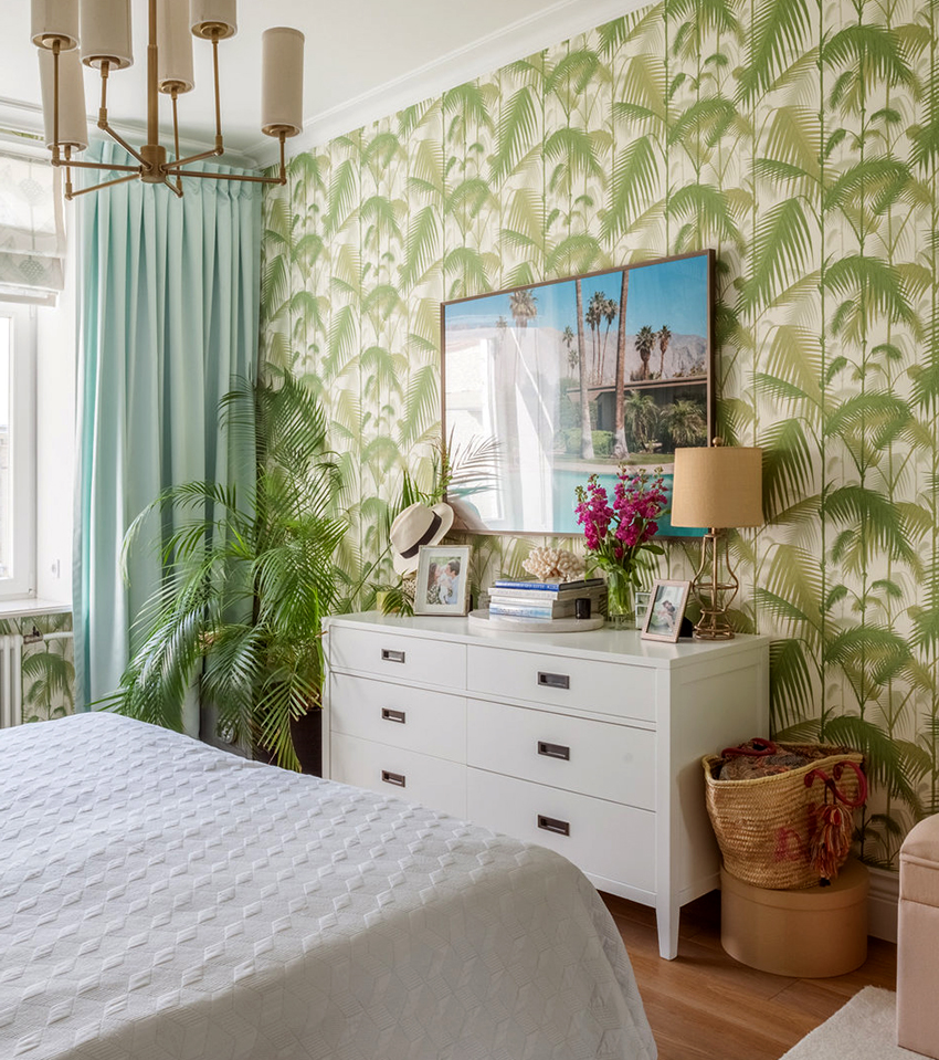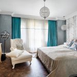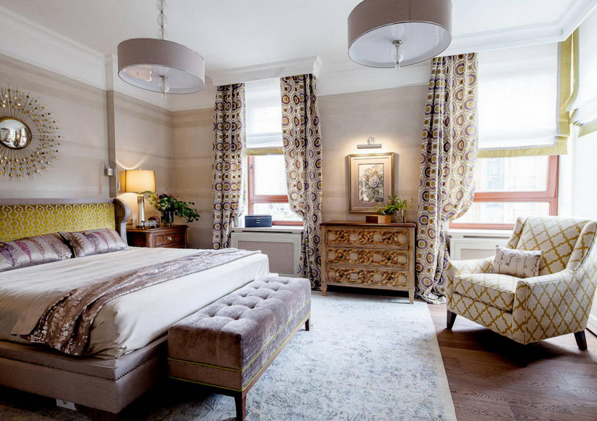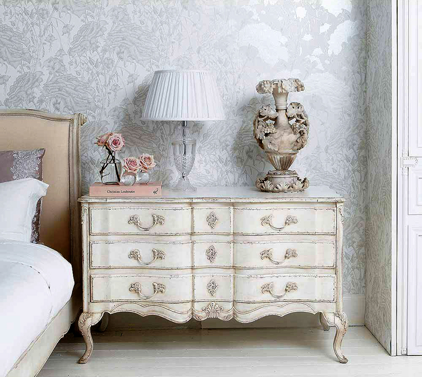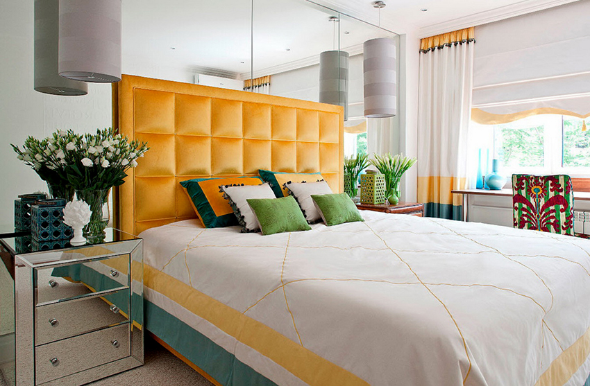 cermin di bilik tidur di atas peti laci, serta banyak elemen hiasan yang berbeza dalam bentuk ukiran atau lukisan, menyumbang kepada reka bentuk bilik yang indah, yang memberikan kecanggihan dan penampilan mewah pada bahagian dalam.