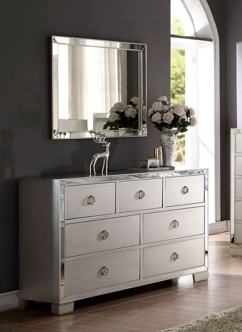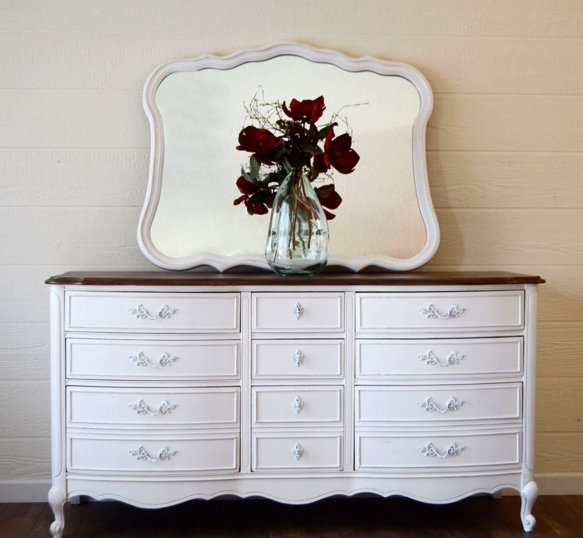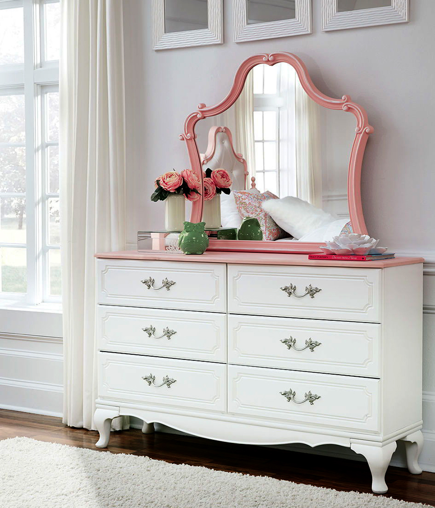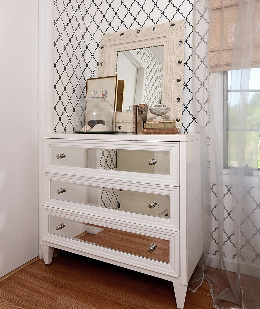 Laci peti dengan cermin di bilik tidur: alternatif untuk meja solek