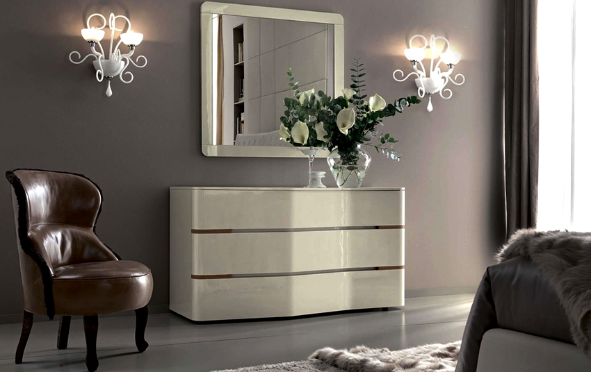 Oleh itu, anda boleh mengganti almari pakaian dan meja rias yang besar dengan satu laci yang luas dan selesa dengan cermin. Foto menunjukkan dengan jelas estetika, fungsi dan pelbagai model perabot seperti itu.Melengkapkan almari dengan lilin indah dan elemen hiasan lain akan membantu mewujudkan suasana yang bergaya dan romantis di bilik tidur. Laci putih dengan cermin kelihatan sangat cantik dan canggih, yang sesuai dengan bilik tidur yang dihiasi dengan gaya yang berbeza.