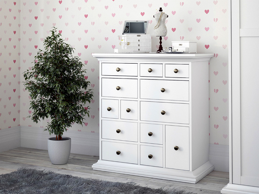 Sering kali, perabot seperti peti laci digunakan di bilik tidur kecil, sementara tidak hanya berfungsi sebagai almari pakaian untuk menyimpan linen, tetapi juga berfungsi sebagai meja rias. Ini kerana perabot kabinet dapat menjimatkan banyak ruang berharga, terutama jika ruangannya kecil. Dalam kes ini, penting bahawa peti laci dilengkapi dengan cermin yang sesuai.