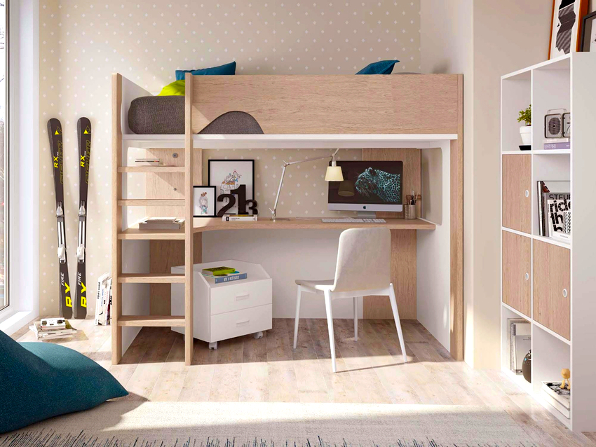 Reka bentuk tinggi dengan kawasan kerja atau ruang santai di tingkat bawah menjimatkan ruang di bilik tidur. Kawasan kerja biasanya kelihatan seperti meja, ukurannya sama dengan parameter tempat tidur. Set perabot dapat dilengkapkan dengan meja dengan rak. Dalam kes ini, kawasan kerja terdiri daripada dua bahagian: rak dan bahagian atas meja. Daripada rak, anda boleh memilih almari pakaian atau meja di sisi katil.