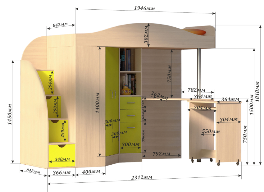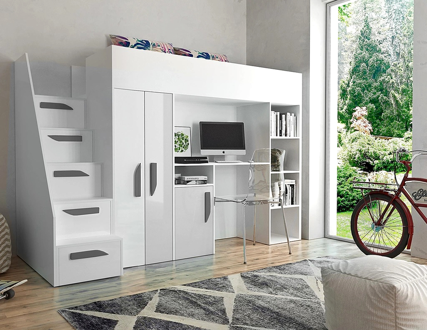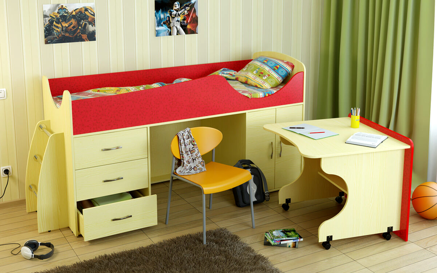Meja berbentuk L adalah reka bentuk yang sangat selesa yang kelihatan seperti meja yang memanjang, di sebelahnya peralatan yang diperlukan dipasang. Pilihan yang sangat selesa dan ergonomik adalah katil loteng untuk dua anak remaja. Terdapat juga pelbagai modifikasi dengan almari pakaian dan laci.