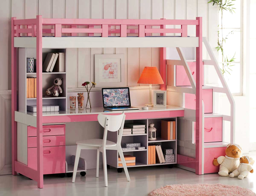 Foto tempat tidur loteng dengan kawasan kerja untuk seorang gadis menunjukkan pelbagai model ergonomik. Untuk kanak-kanak perempuan, reka bentuk tidak teratur lebih sesuai - dalam bentuk gelombang atau dengan selekoh, serta produk dengan tempat duduk separuh bulatan.