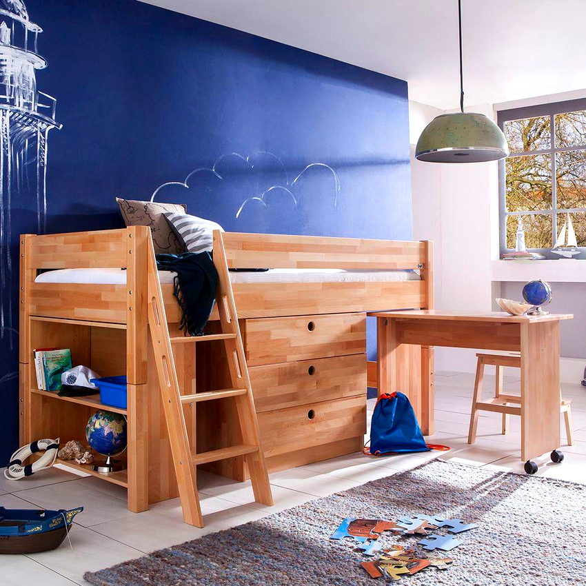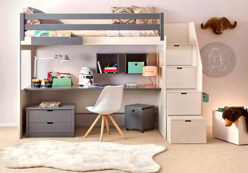 Foto tempat tidur loteng jelas menunjukkan bahawa sebagai hasil penggunaan struktur rendah dengan kawasan kerja, terdapat cukup ruang untuk tempat duduk anak yang selesa. Perlu juga diperhatikan bahawa pergerakan wajib anak menaiki tangga sekali sehari tidak menimbulkan kesulitan. Di samping itu, kanak-kanak dan remaja menyukai model yang kompleks dan sudut rahsia untuk kelas, permainan, dan kerja komputer.