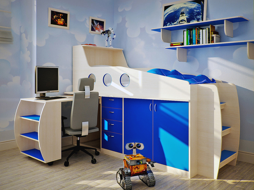 Pilihan terbaik untuk mengatur bilik remaja adalah tempat tidur dengan ruang kerja terbina dalam. Reka bentuk yang digabungkan dengan meja sangat popular. Anda dapat melihatnya dalam foto katil loteng kanak-kanak untuk kanak-kanak lelaki. Meja tulis atau komputer boleh digabungkan dengan rak, kabinet atau meja di sisi katil.