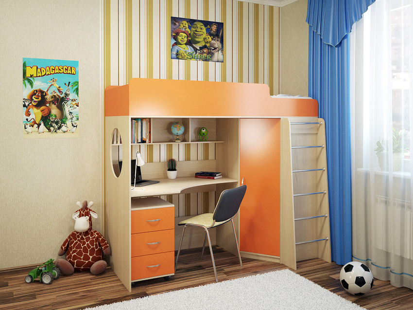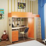 Nasihat berguna! Memilih pilihan tempat tidur dengan kawasan kerja, lebih baik memilih model dengan modul bawah yang boleh ditanggalkan. Ini akan memungkinkan untuk menyusunnya dari masa ke masa, kerana seiring bertambahnya usia, selera anak dapat berubah.