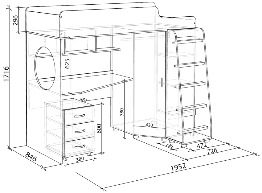 Tempat tidur loteng untuk seorang gadis terdiri dari tempat tidur di tingkat atas, di bahagian bawahnya terdapat laci dan meja sisi tempat tidur, serta pelbagai rak