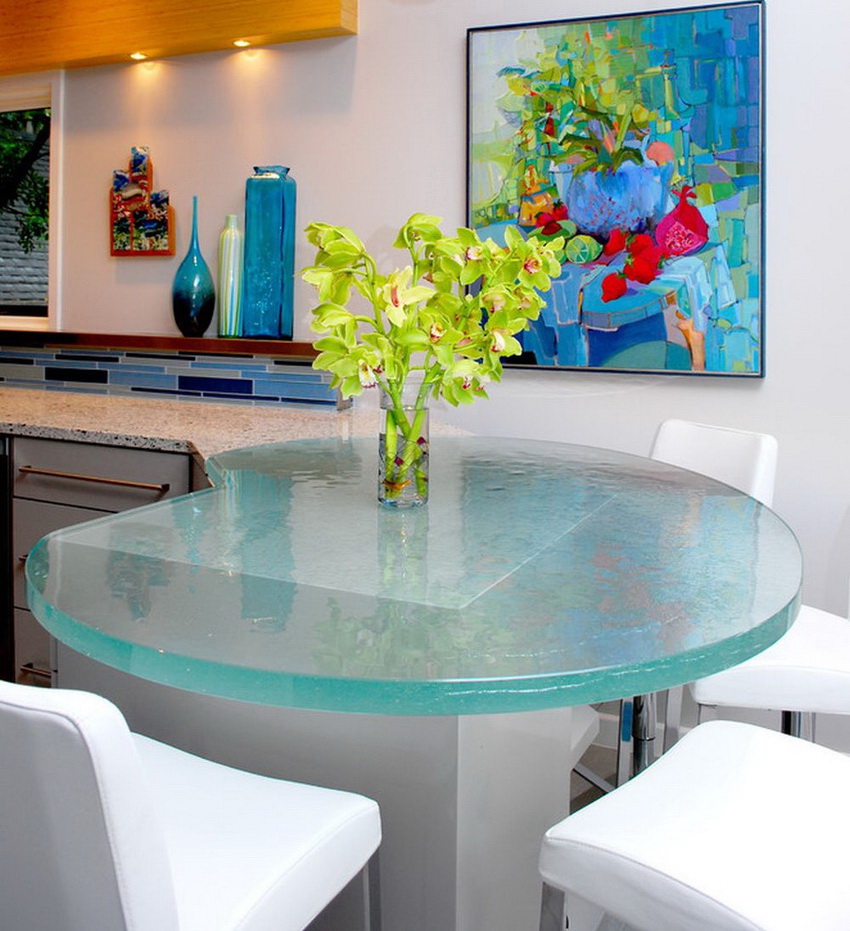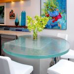 Baru-baru ini, meja kaca bulat di dapur mendapat populariti. Untuk pembuatan countertop, kaca tempered digunakan, yang merupakan bahan tahan lama yang tahan terhadap tekanan mekanik, dan bahkan jika terjadi keretakan, ia pecah menjadi serpihan ringan, sehingga menghilangkan kemungkinan cedera.