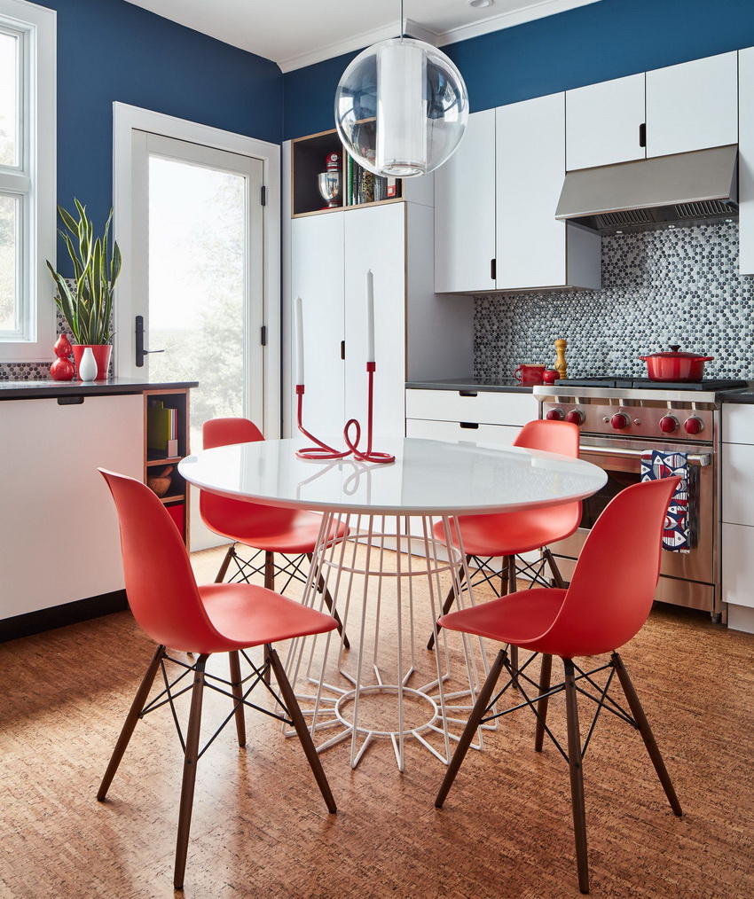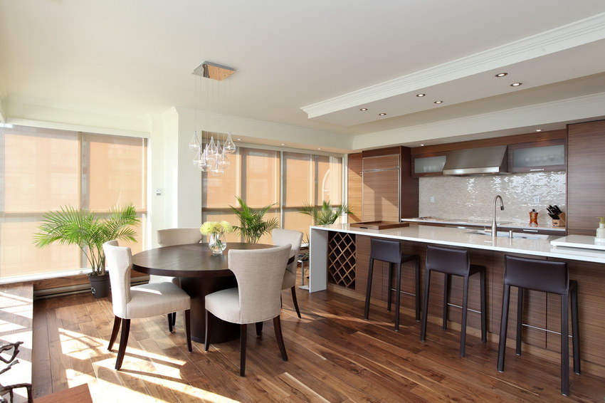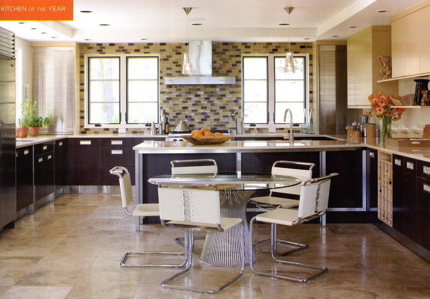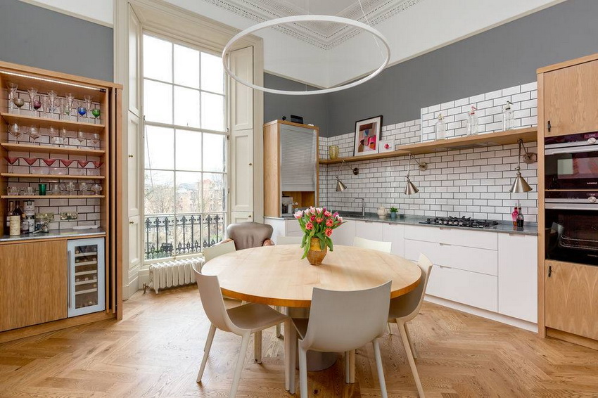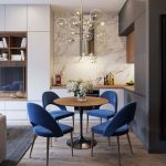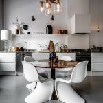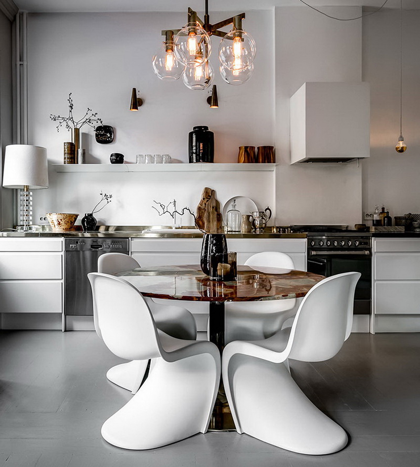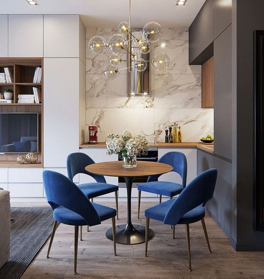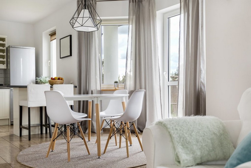 Nasihat berguna! Pereka pasti tidak mengesyorkan memilih model meja makan setelah memasang permukaan kerja, kabinet, kotak pensel dan meja malam.Ini pasti akan membawa kepada keadaan di mana sesuatu yang sesuai di dalam bilik hanya dibeli, tanpa mengambil kira gaya dalaman yang umum.