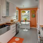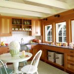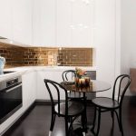 Menyiapkan meja bulat di dapur kecil sangat sukar. Kemungkinan besar anda perlu menjimatkan ruang dengan perbelanjaan perabot lain. Sekiranya kawasan penempatan mempunyai dimensi 220x220 cm atau sedikit kurang, diameter meja bulat di dapur 80 cm adalah pilihan yang paling boleh diterima.