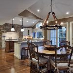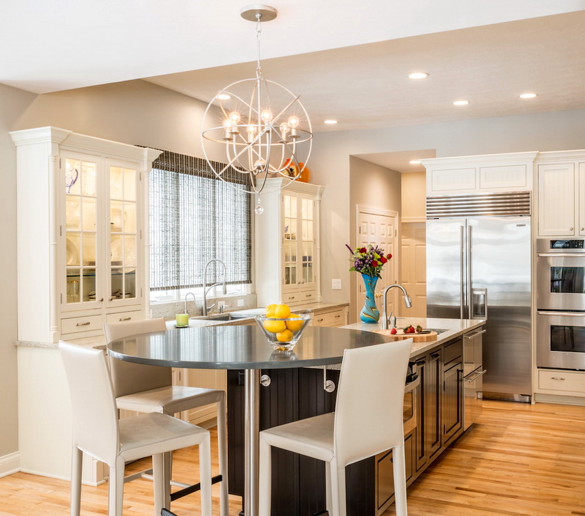 Nasihat berguna! Semasa membeli meja bulat untuk dapur, anda mesti mengambil kira kaedah pencahayaan. Sekiranya menempati ruang sudut atau diimbangi dengan ketara dari pusat tempat lampu siling utama berada, lebih baik mengatur pencahayaan tambahan. Ini akan melengkapkan reka bentuk, mengaburkan ruang makan dari kawasan kerja, dan mewujudkan keselesaan tambahan.
