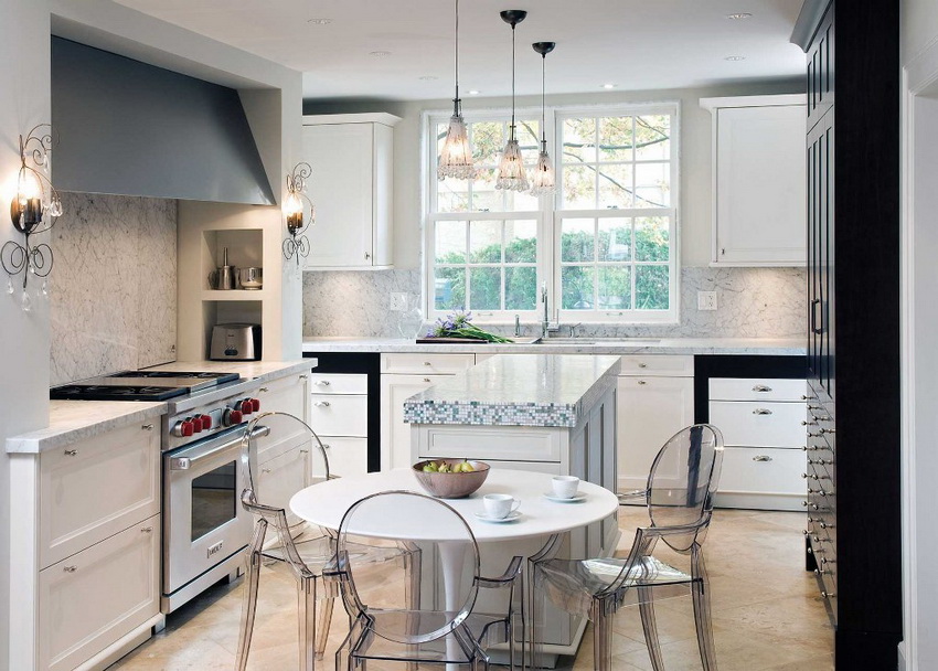 Sekiranya meja dapur putih dipilih dengan baik, dalaman yang mewah dijamin. Warna hidangan dan hidangan yang disajikan menjadi lebih cerah dan lebih enak dengan latar belakang meja putih.Meja bulat gelangsar putih di dapur dengan permukaan berkilat mencipta suasana kesungguhan dan kemegahan di kawasan itu.