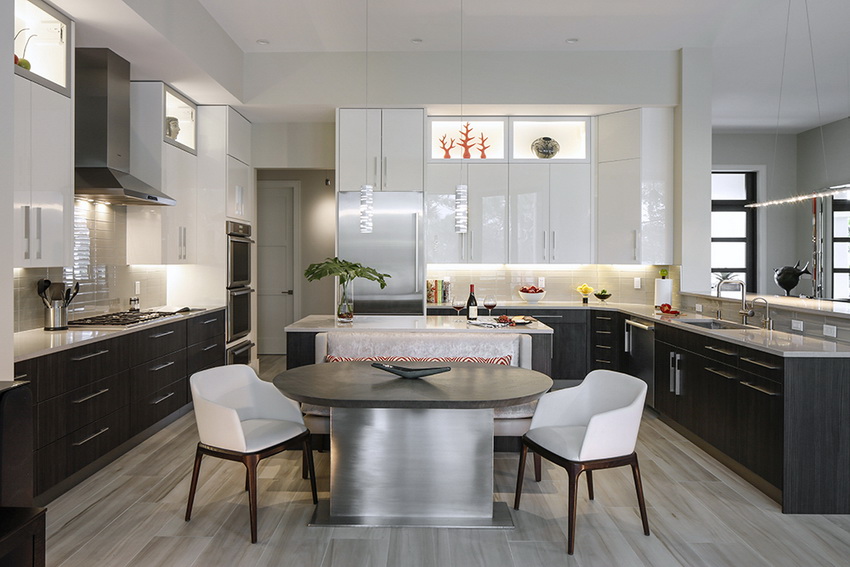 Bentuk bulat dan gaya berteknologi tinggi moden tidak asing. Bahan dan warna kontras yang terang mendominasi di sini. Permukaan kaca, logam, berkilat adalah ciri khas meja dapur gaya ini.