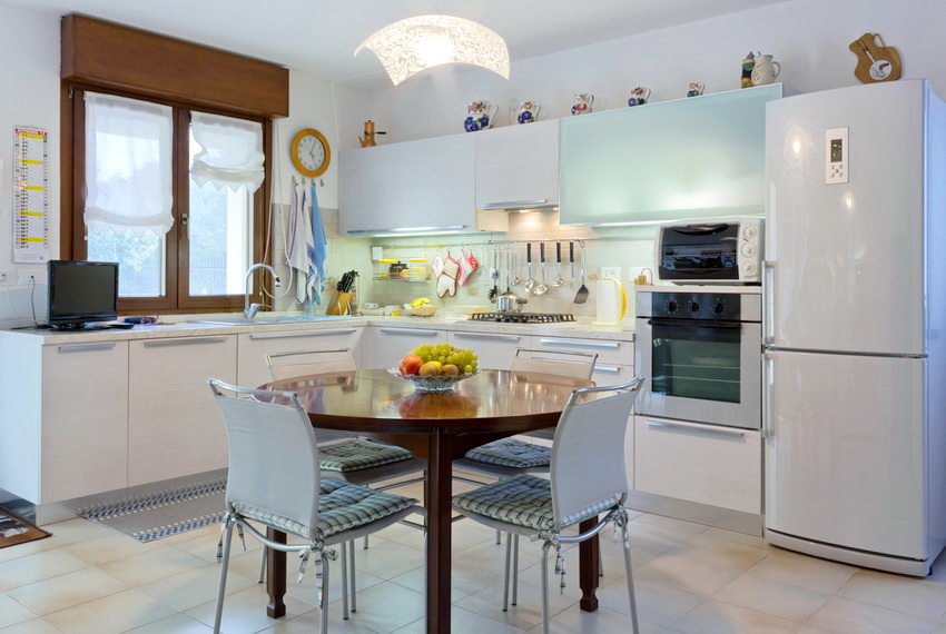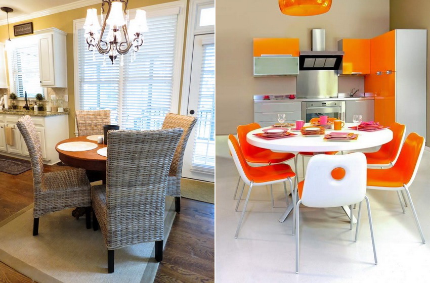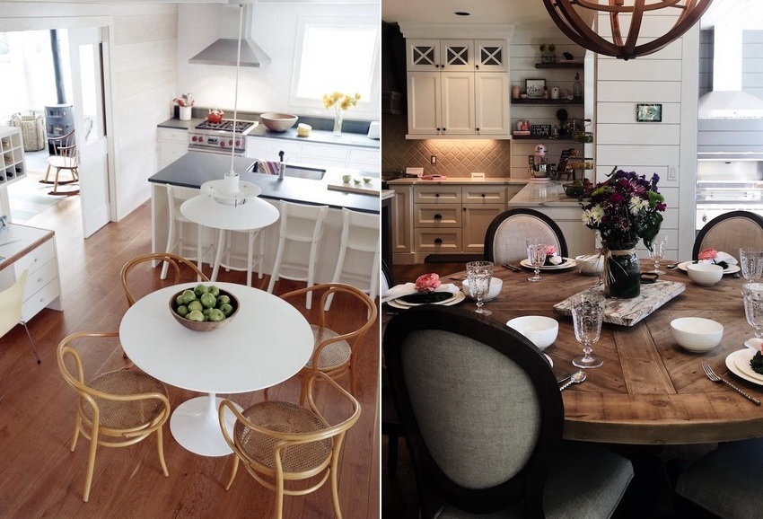 Semasa membeli meja bulat untuk dapur, anda harus mengukur ruang dengan berhati-hati dan memastikan bahawa ia sesuai dengan keseluruhan reka bentuk