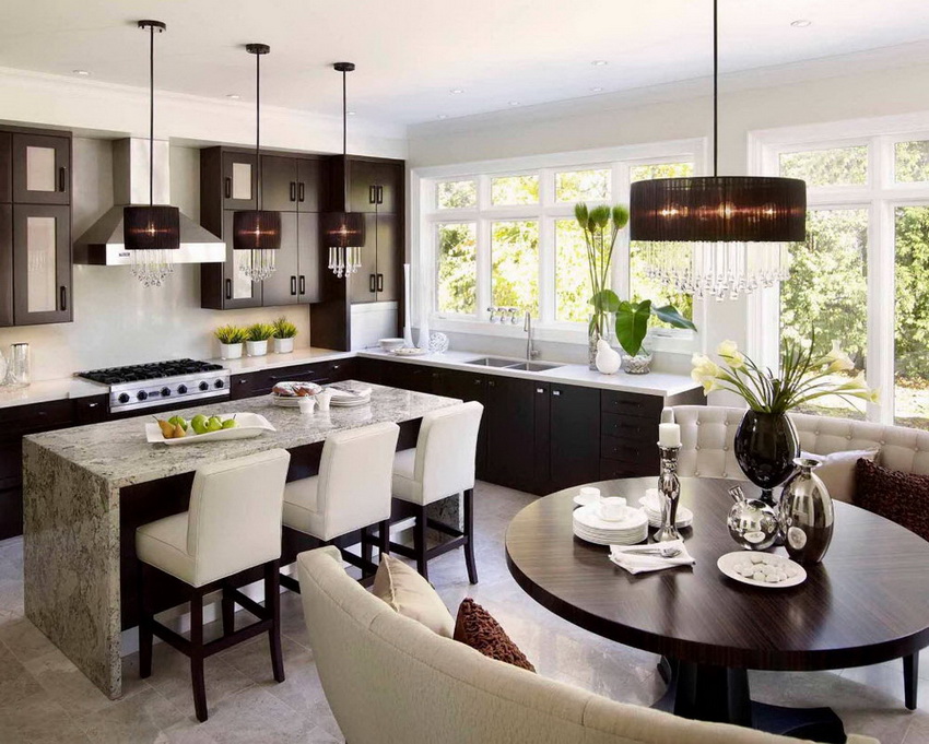 Dekorasi yang dipilih dengan betul membolehkan anda membuat komposisi dapur tunggal dengan meja bulat
