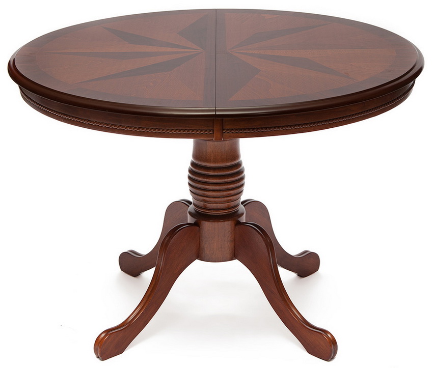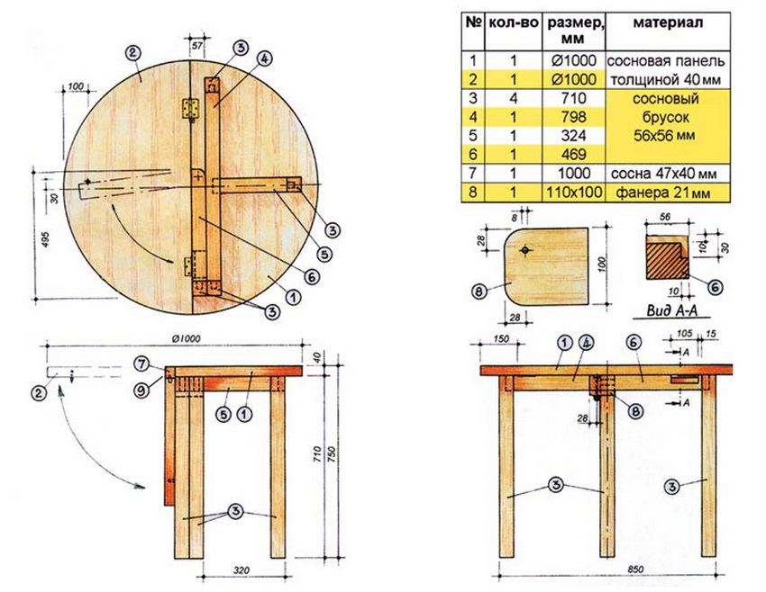 Meja bulat kayu adalah struktur pasang siap, di mana bahagian atas meja dan kerangka bawahnya dibuat secara berasingan (bingkai sisi dan blok kaki, yang, bergantung pada model, dapat saling terhubung, atau dapat dipasang pada bingkai sisi masing-masing secara berasingan) Pengancing dilakukan dengan skru perabot, skru mengetuk sendiri, menggunakan gam kayu.