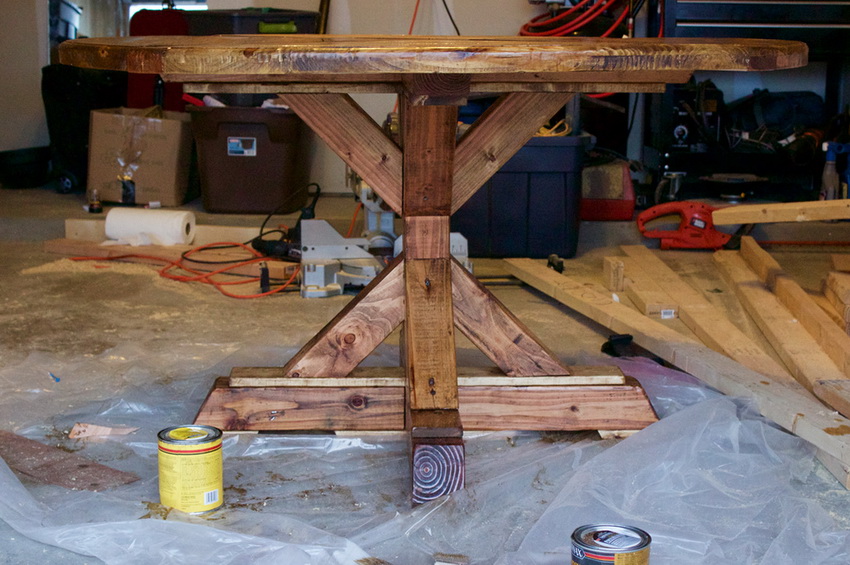 Setelah membuat meja bulat dari kayu dengan tangan anda sendiri, anda perlu menutup produk dengan cat dan varnis untuk meningkatkan jangka hayatnya