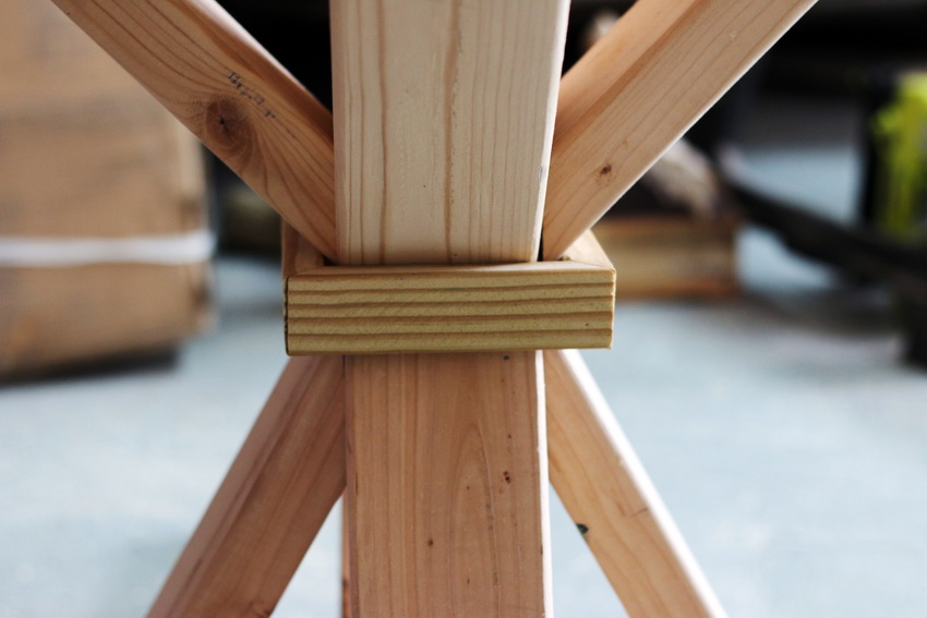 Dengan cara yang serupa, anda boleh membuat meja bulat secara bebas untuk dapur dengan satu kaki. Bar persegi 100x100 mm tambahan diperlukan untuk elemen sokongan utama. Ia melekat pada bahagian tengah salib. Kemudian bar yang disiapkan untuk kaki dipotong separuh (ada 8 daripadanya), potongan dibuat pada masing-masing pada sudut 45 ° dari semua sisi, 4 kaki dilekatkan di tengah palang salib dan ke tengah sokongan utama. Selebihnya 4 bahagian dipasang pada bahagian tengah kaki bar utama dan menyimpang ke sisi, meningkatkan kawasan sokongan keseluruhan struktur.