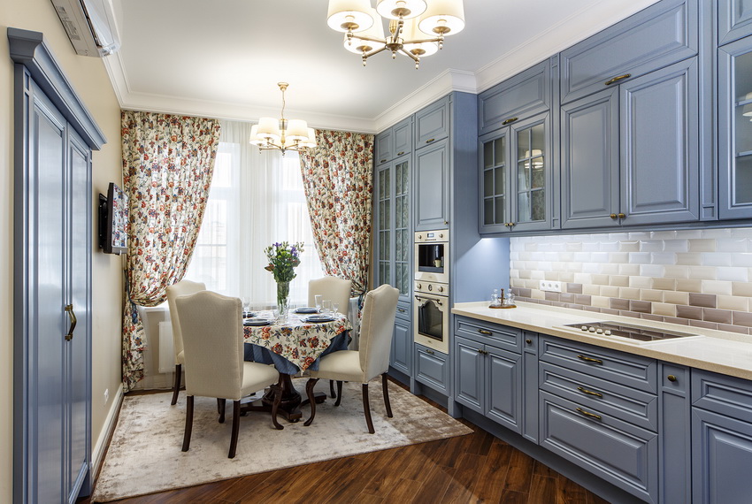 Memandangkan kawasan kecil dapur panel khas dan pelbagai selera pengguna, meja makan bulat tersedia dalam pelbagai saiz. Tetapi di meja terkecil, 4 orang boleh duduk.