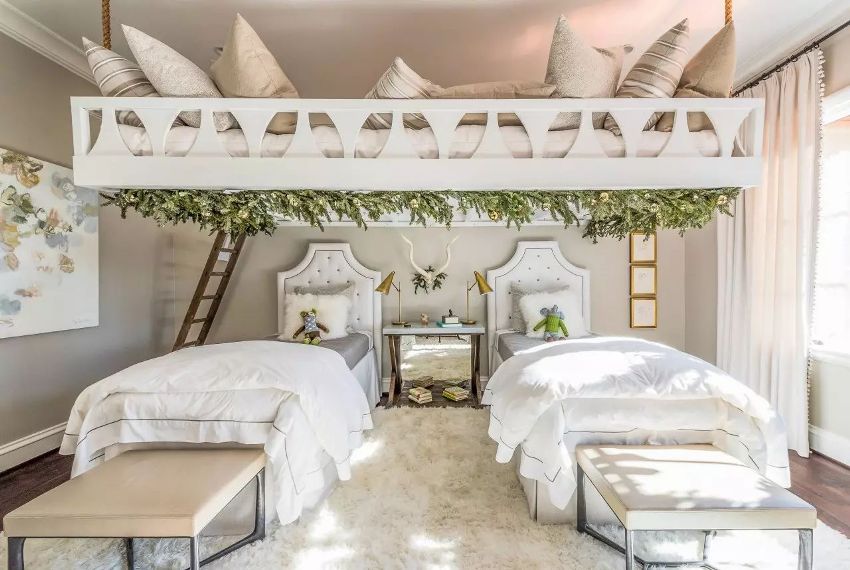 Katil loteng menarik dari segi reka bentuk dan berfungsi. Di dalam rumah, ia boleh dipasang di sudut bersebelahan dan bertentangan, di sepanjang dinding, selari antara satu sama lain, kepala ke kepala katil, dan lain-lain. Semuanya bergantung pada keinginan, usia dan jantina anak-anak. Dalam foto di Internet, model diusulkan baik dengan tangga yang dipindahkan ke kaki (pilihan ini menjimatkan ruang sebanyak mungkin), dan dengan tangga dan tangga di luar tempat tidur.