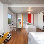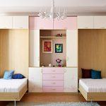 Kami menawarkan pilihan untuk katil, almari pakaian, meja yang dipasang secara berasingan - dalam gambar cermin. Kaedah ini sesuai untuk kawasan yang luas. Pereka mencadangkan untuk melengkapkan bilik kecil dengan perabot susun (tempat tidur yang diangkat ke tingkat tertentu, rak gantung, almari pakaian).Pilihan perabot ini dapat menjimatkan ruang dengan ketara.