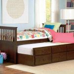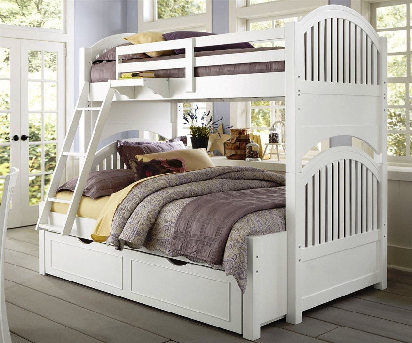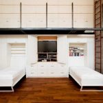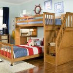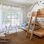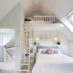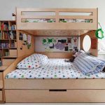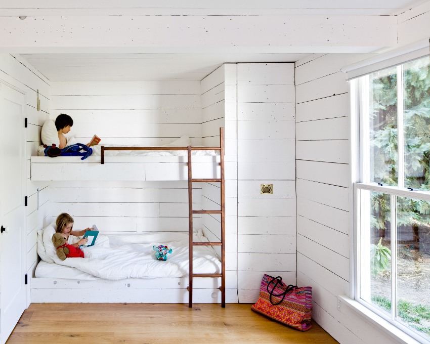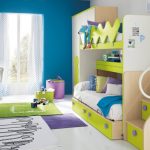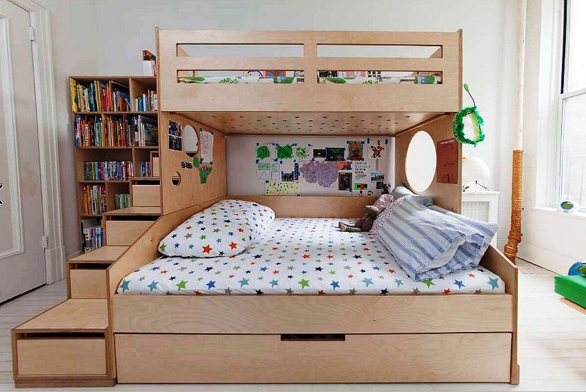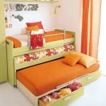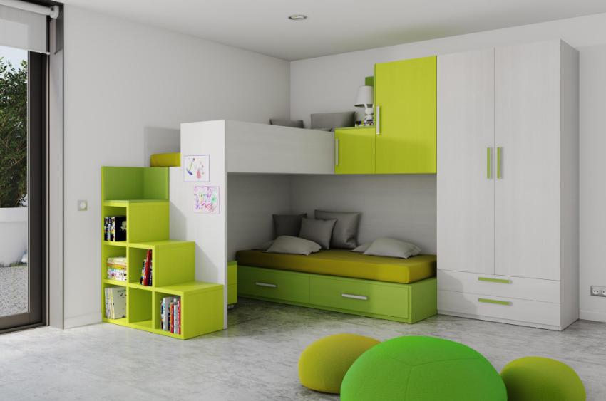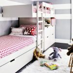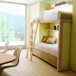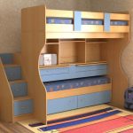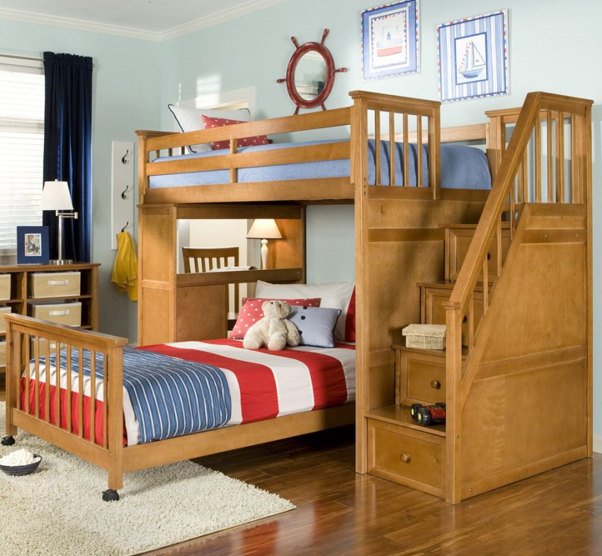 Menggunakan katil dua tingkat akan membantu anda menggunakan ruang di bilik anak anda secara ekonomi. Pendakian ke tingkat dua boleh diatur menggunakan tangga dan tangga. Mempunyai dua laci di bawah katil bawah akan menyediakan sejumlah besar ruang simpanan linen atau barang-barang lain.