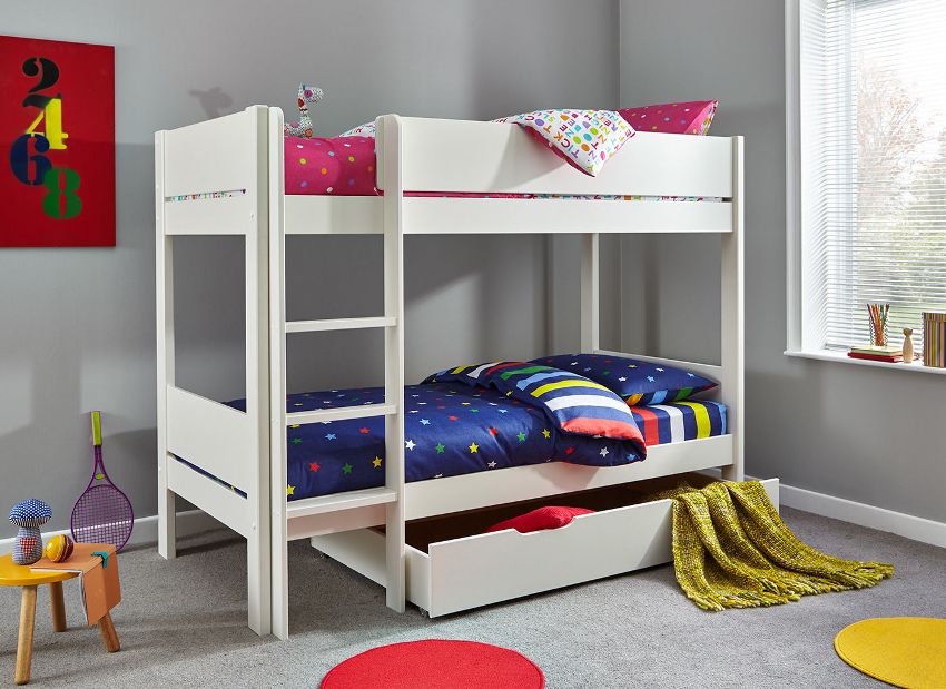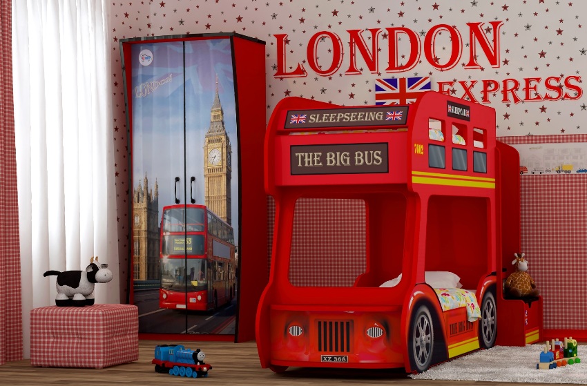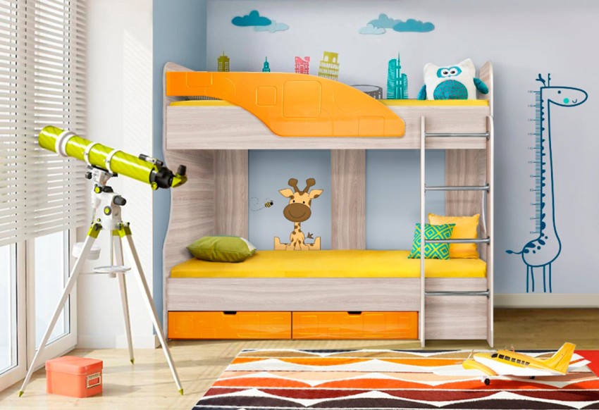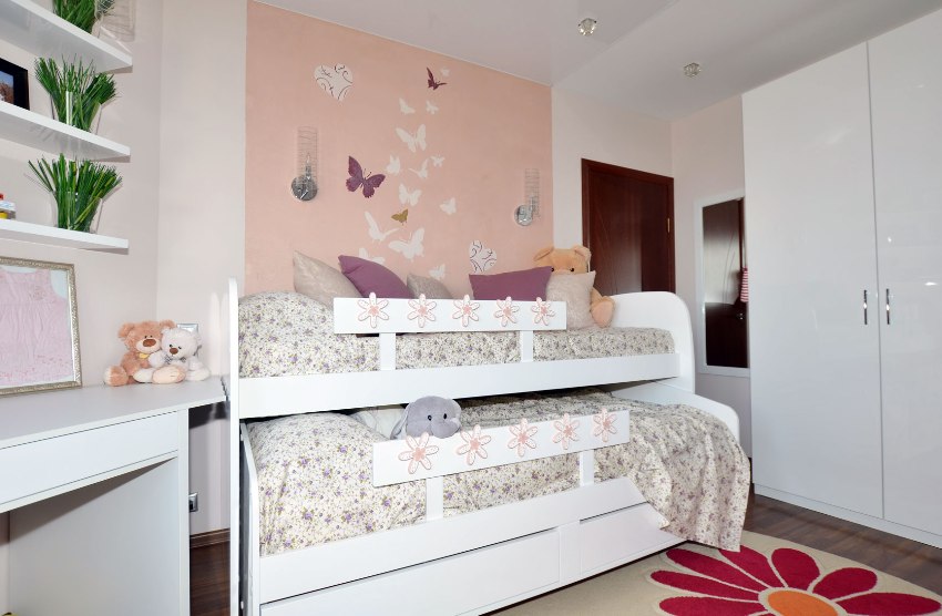 Masih menyusun perabot dan melengkapkan hiasan dalaman dengan pilihan tekstil dan hiasan (jika dikehendaki). Walau bagaimanapun, membeli alat dengar siap juga mempunyai beberapa kekurangan. Selalunya ukuran katilnya sama. Sekiranya terdapat perbezaan usia yang besar antara anak-anak, tidak akan selesa bagi seseorang untuk tidur. Harus diingat bahawa tidak selesa berada di tempat tidur kecil dan besar.