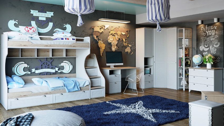 Memilih perabot kanak-kanak untuk dua lelaki lebih mudah dari segi reka bentuk. Kekangan, kesederhanaan garis, kombinasi warna sederhana dialu-alukan. Warna biru, biru, kelabu, coklat, kuning air, hijau sangat sesuai untuk menghiasi bilik kanak-kanak lelaki.