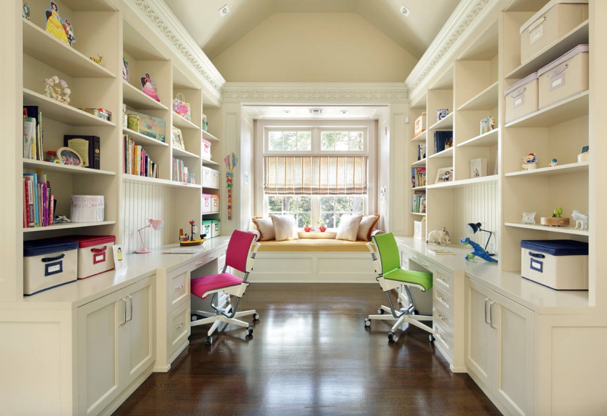 Dengan bermulanya aktiviti sekolah, rutin harian anak-anak berubah dengan ketara, pekerjaan timbul, rasa tanggungjawab lebih aktif ditunjukkan dan kemahiran organisasi diri yang lebih serius terbentuk. Tempat kerja individu adalah mustahak untuk semua orang. Jenis perabot yang paling penting untuk tujuan ini adalah meja. Gambar meja di bilik kanak-kanak untuk dua orang pelajar menggambarkan pelbagai model. Pilihan yang paling biasa adalah meja panjang segi empat tepat, dipisahkan oleh unit laci dalam dua warna, supaya anak-anak tidak mengelirukan penyimpanan barang sekolah mereka.