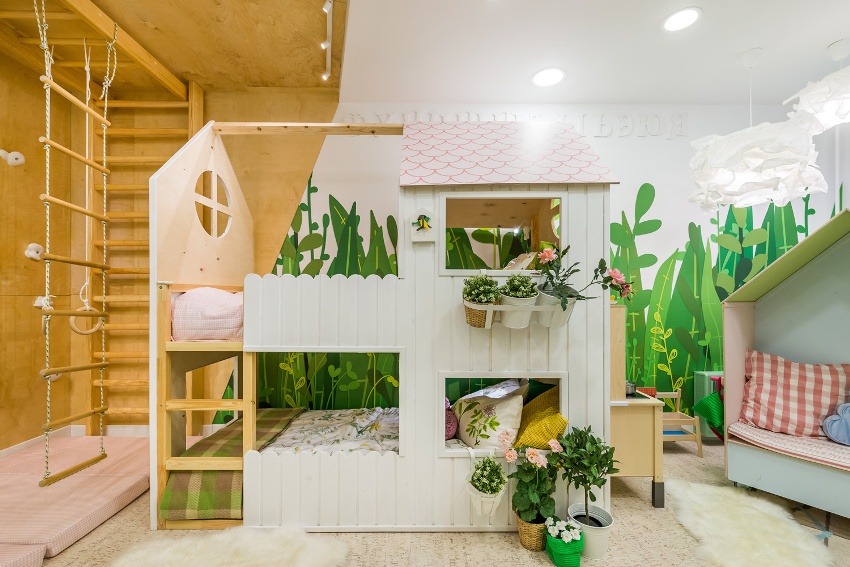 Proses menyusun perabot di taman asuhan kanak-kanak sangat dipermudah, kerana tidak merangkumi menentukan tempat selesa yang optimum, tetapi sebaliknya, tempat-tempat di taman asuhan dipenuhi dengan unsur-unsur yang dipilih khas. Ada peluang untuk mengatur ruang "untuk pertumbuhan". Maksudnya, ketika kanak-kanak membesar, anda boleh menggabungkan meja sisi katil ke dalam almari pakaian atau membuat mezanin daripadanya, membebaskan ruang untuk kerusi atau peralatan sukan yang asli.