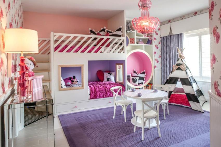 Bilik gadis dicirikan dengan nada lembut, bersih dan lembut. Anda tidak perlu menggunakan warna merah jambu. Bahagian dalaman yang menyenangkan akan dihasilkan dengan warna ungu, kuning air, pasir, pudina. Perabot untuk dua gadis mesti dipilih dengan cahaya visual, tanpa sudut tajam, dengan perincian bulat.