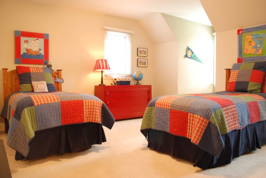 Tilam keras sesuai untuk satu kanak-kanak, tilam keras sederhana untuk anak yang lain. Perselisihan faham mengenai bantal, selimut, karpet. Dan ini adalah perbezaan visual yang ketara antara tempat tidur. Jangan meletakkan katil di sebelahnya - dan bahagian dalam tidak akan menderita.